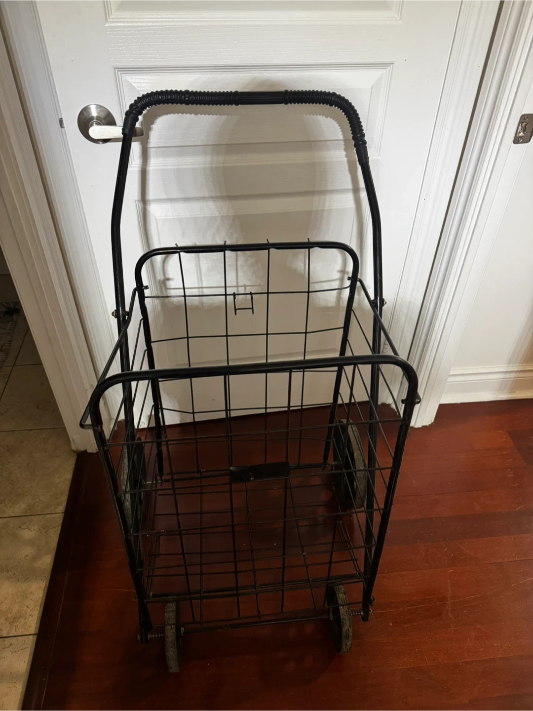 This foldable shopping cart is perfect for carrying groceries or laundry with ease. This cart is in good condition, ready to make your shopping trips a breeze.