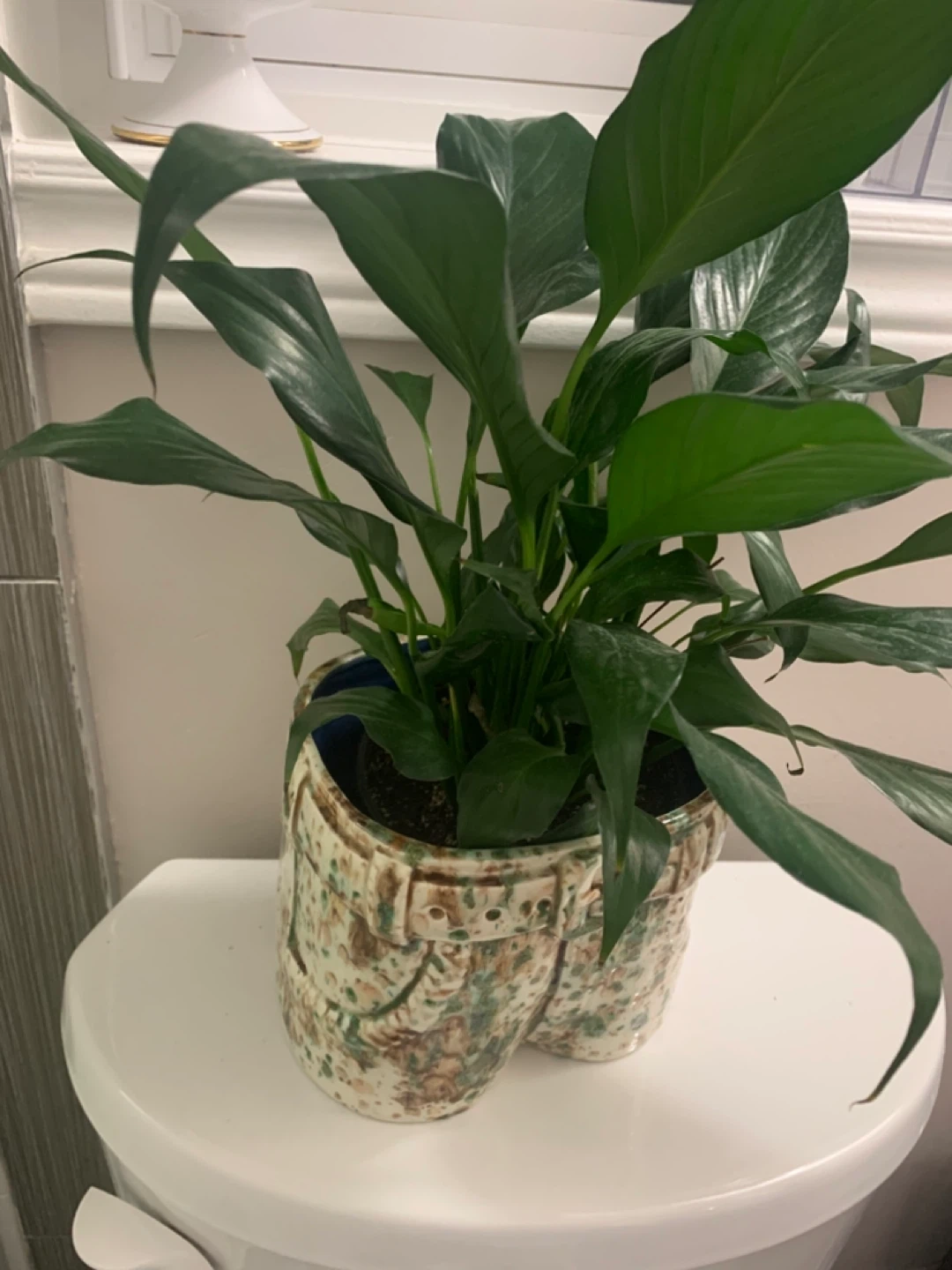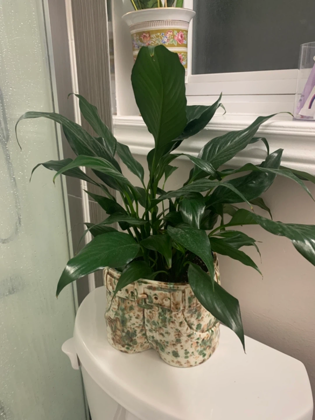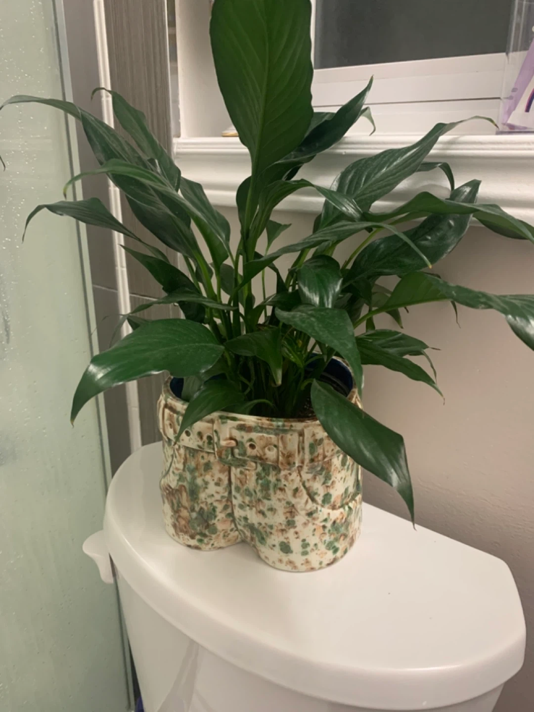 This is a healthy Peace Lily plant in a fun, novelty pot shaped like a pair of jeans. It's a real conversation starter for any room!
