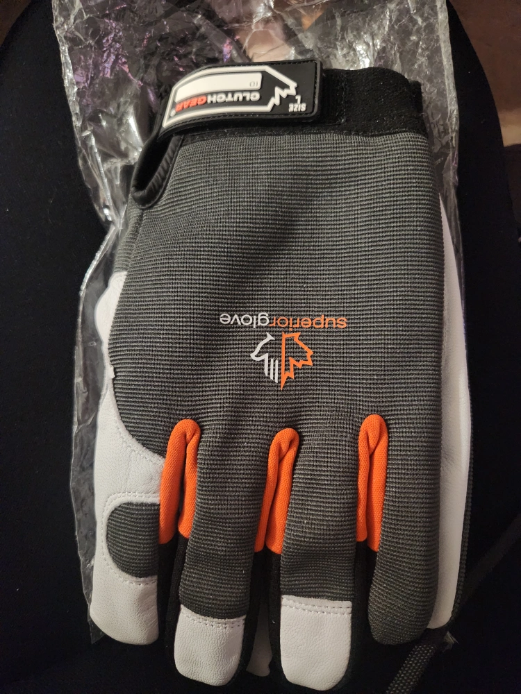 Superior Glove Clutch Gear work gloves in grey and orange. Size 10. These gloves are new in packaging. They're great for general labour or heavy-duty tasks.