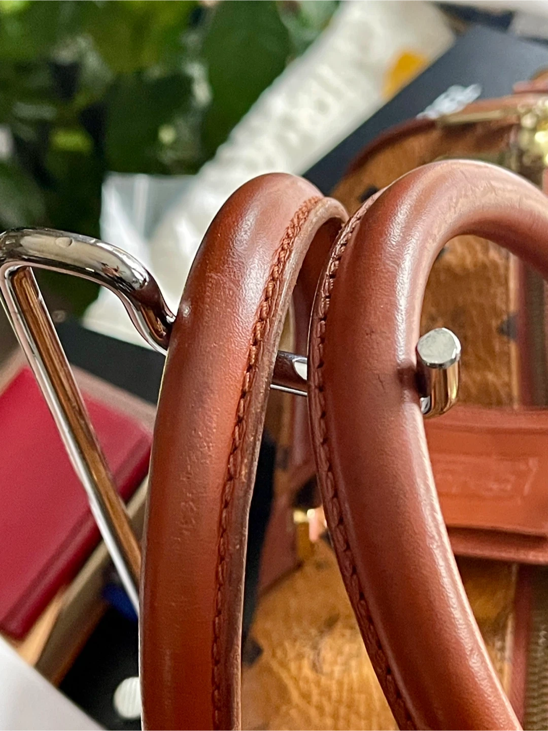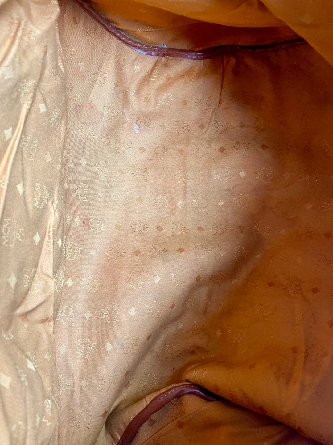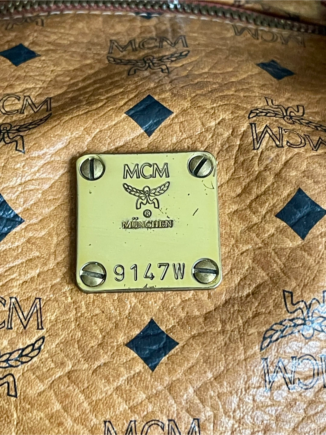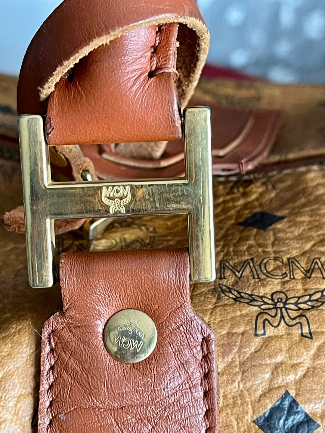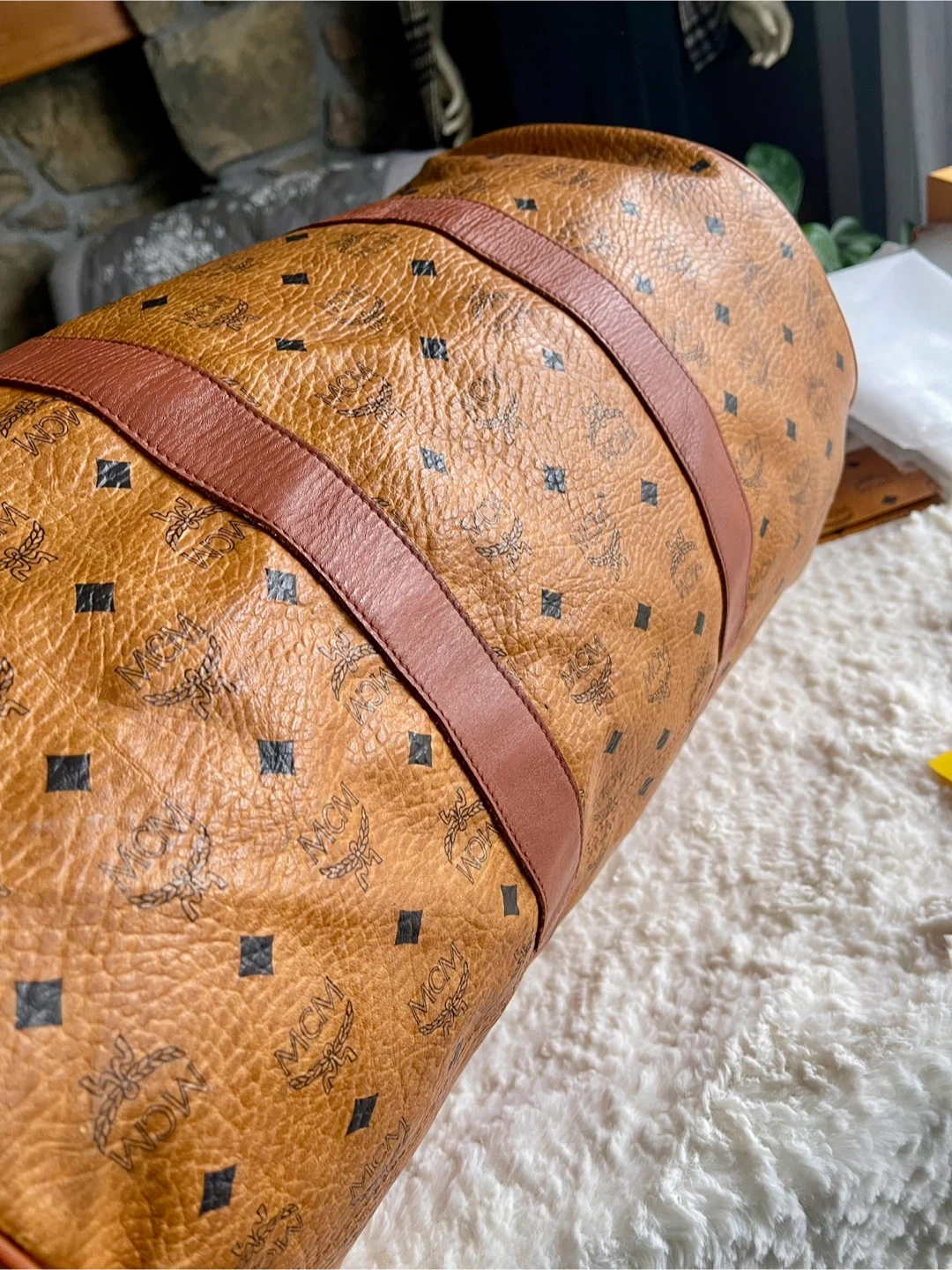 This MCM weekender bag features the signature monogram print. It has sturdy leather handles and an adjustable shoulder strap. This is a spacious bag for travel!