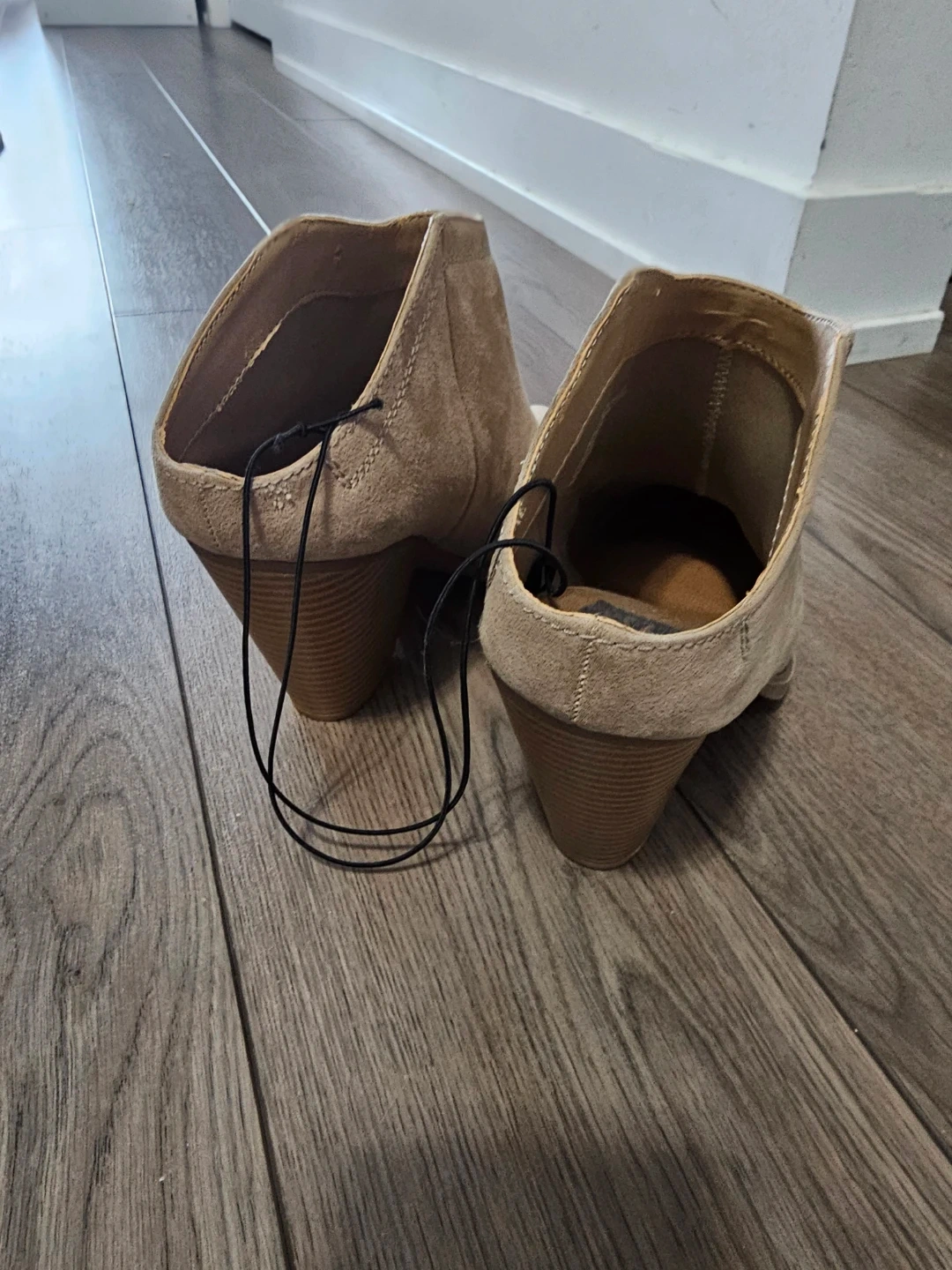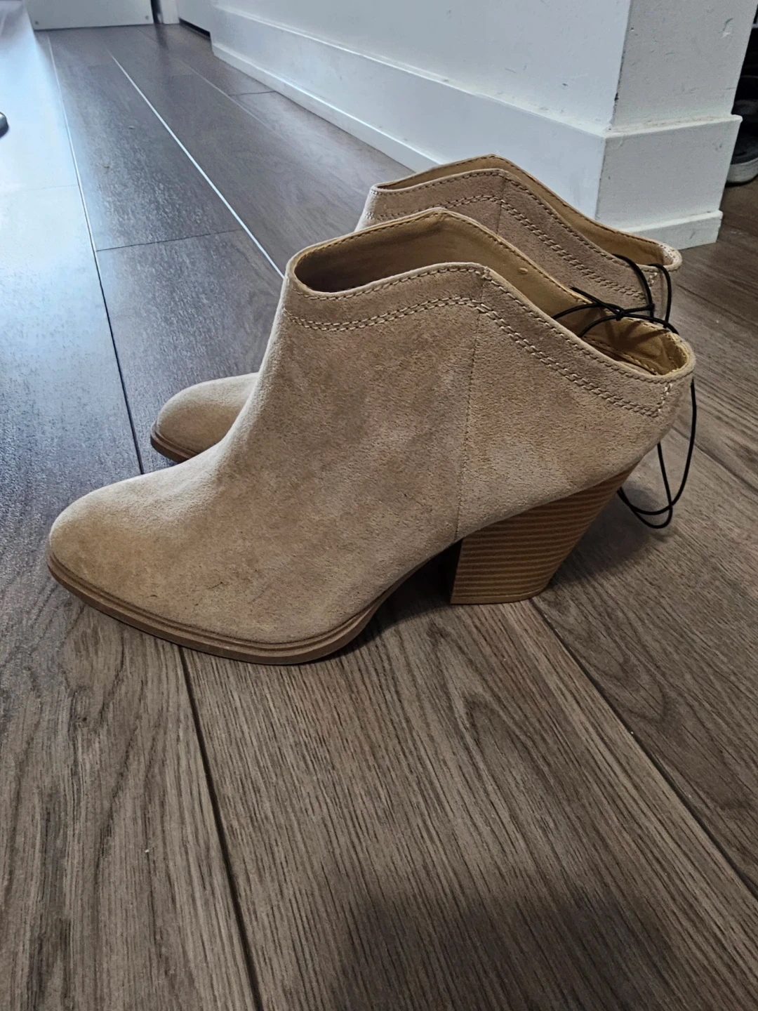 These tan suede heeled ankle boots offer a stylish look with a comfortable fit. They feature a side cut-out design and a stacked wooden heel. Perfect for dressing up or down!