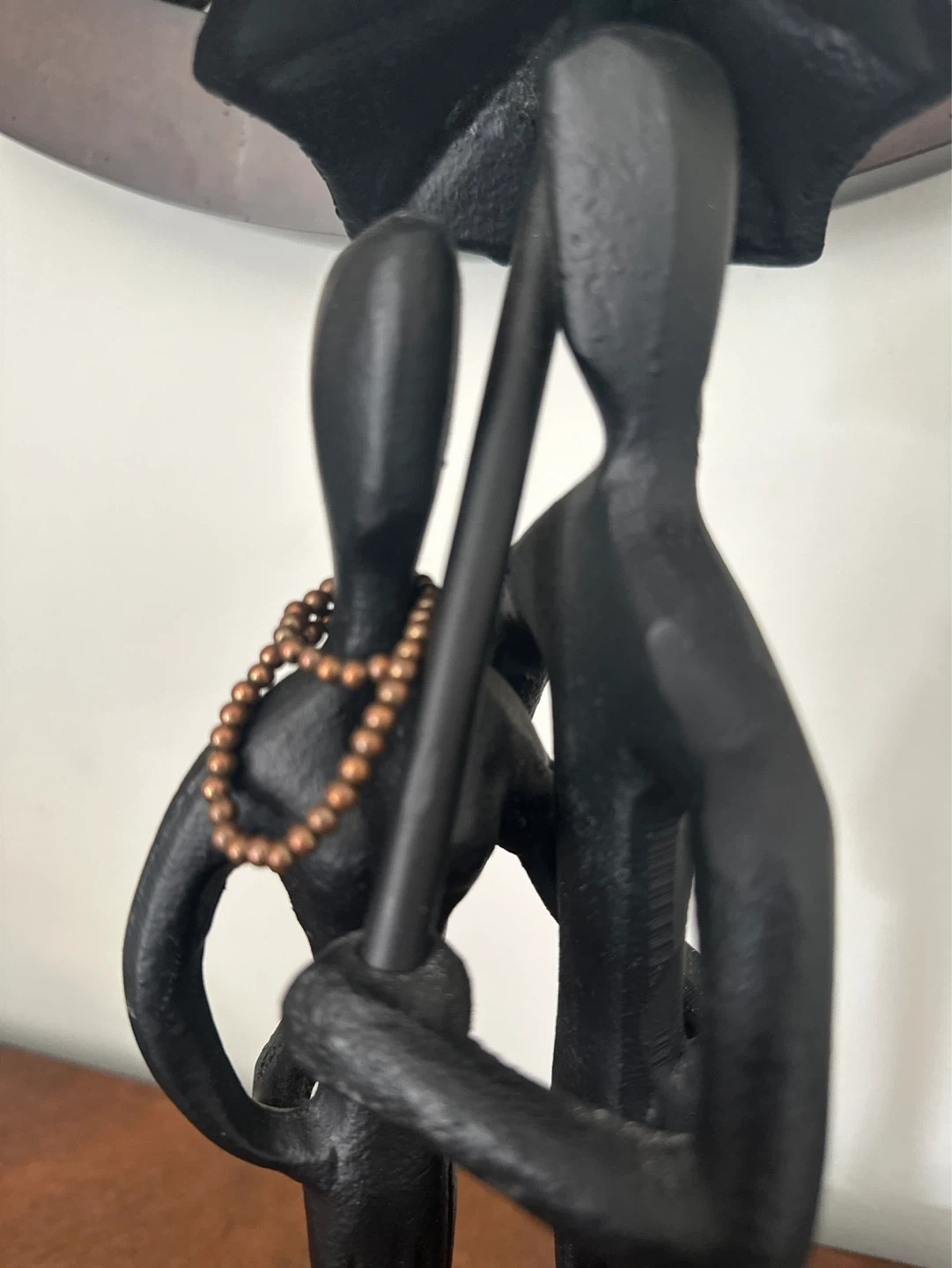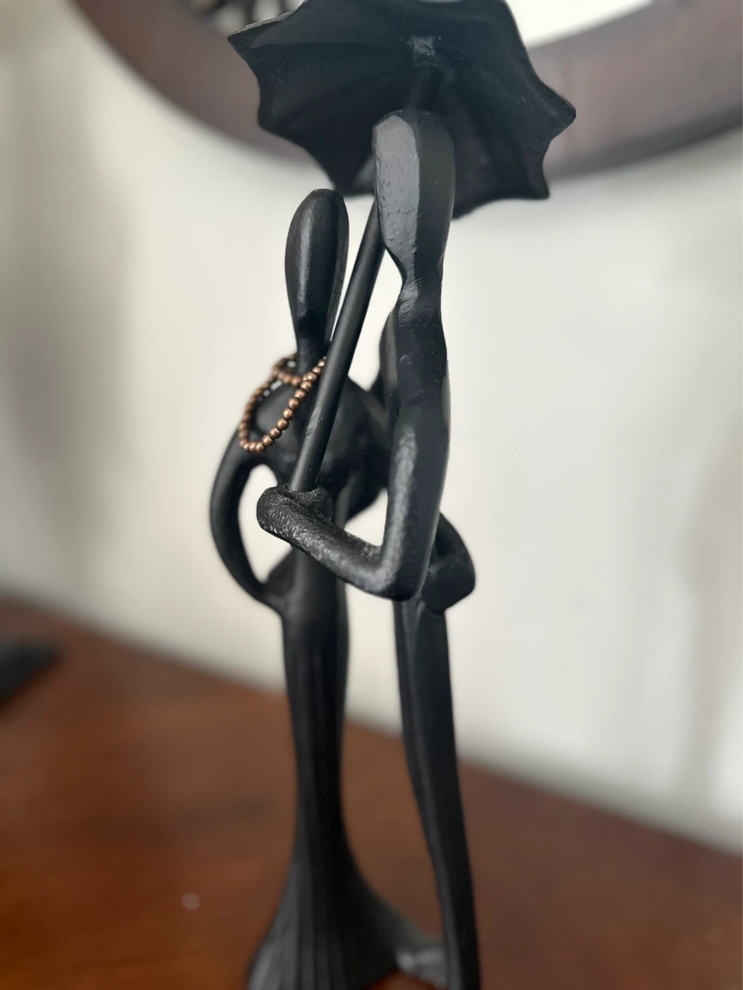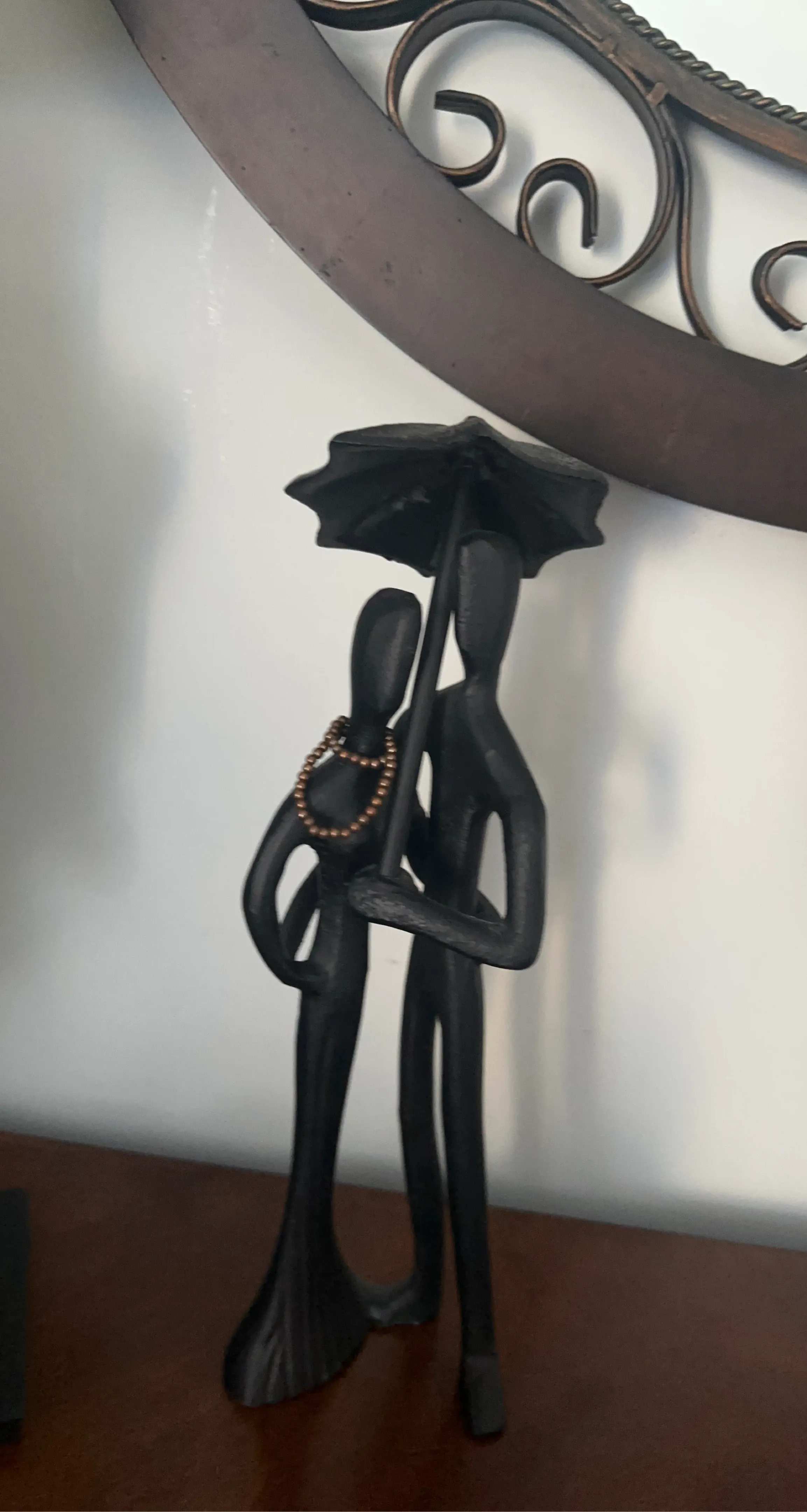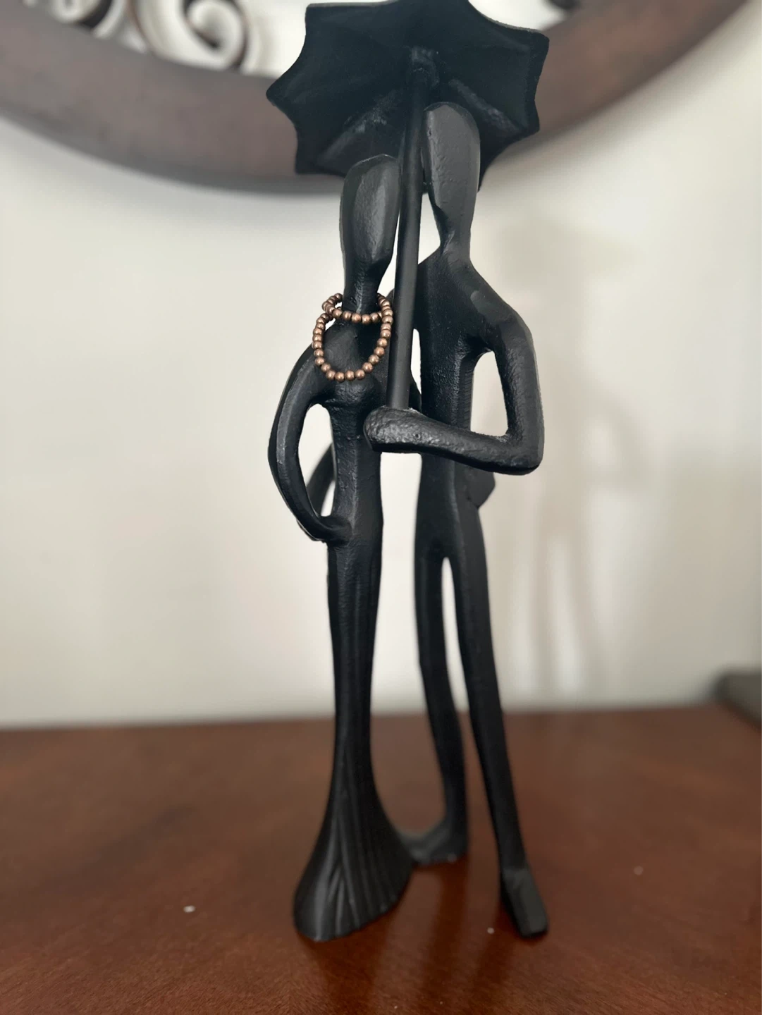 Black metal figurine of a couple sharing an umbrella, adorned with a beaded necklace. Adds a touch of romance to any decor.