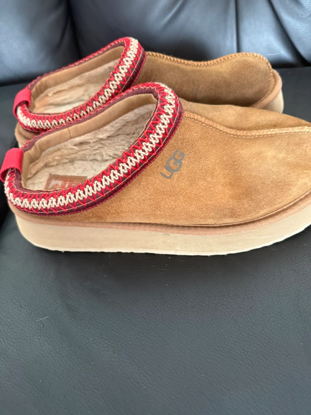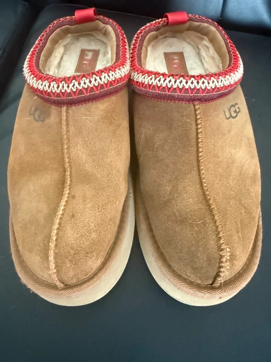 UGG slip-on slippers in a classic brown suede. Features a cozy shearling lining and decorative trim around the opening. Perfect for lounging around the house!