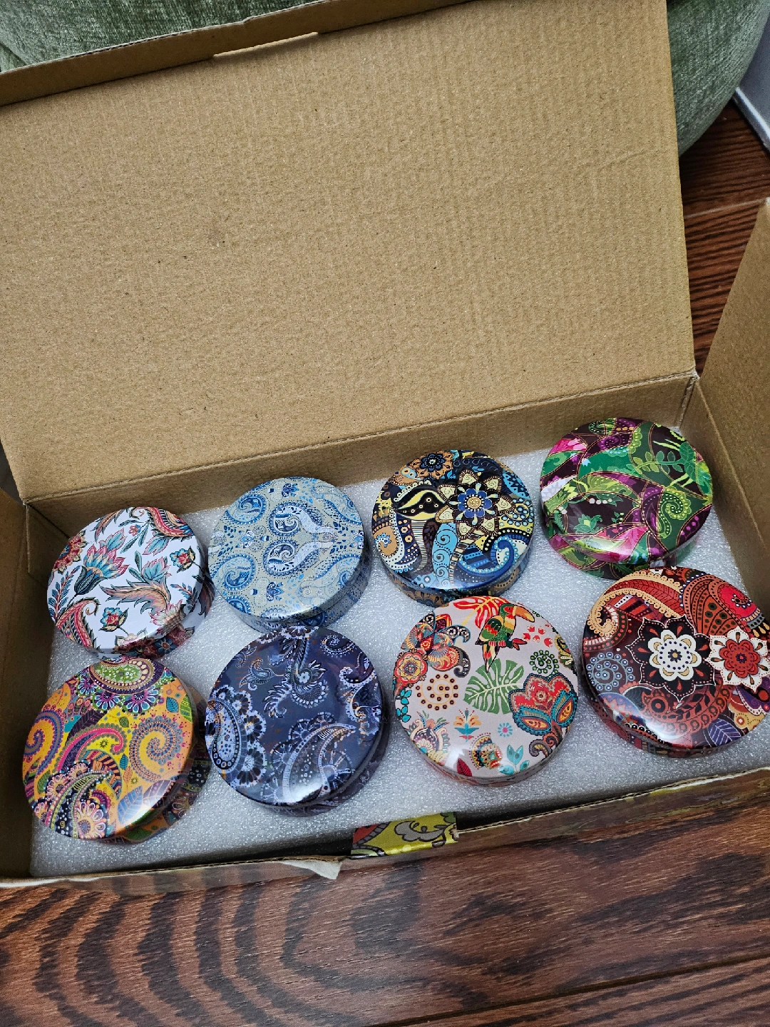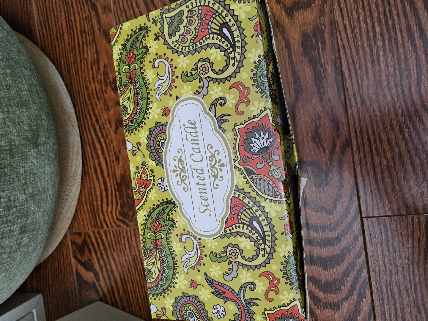 Selling a set of scented candles. They come in a decorative box with a paisley pattern. Each candle has a unique design on its lid. Perfect for creating a cozy atmosphere in your home