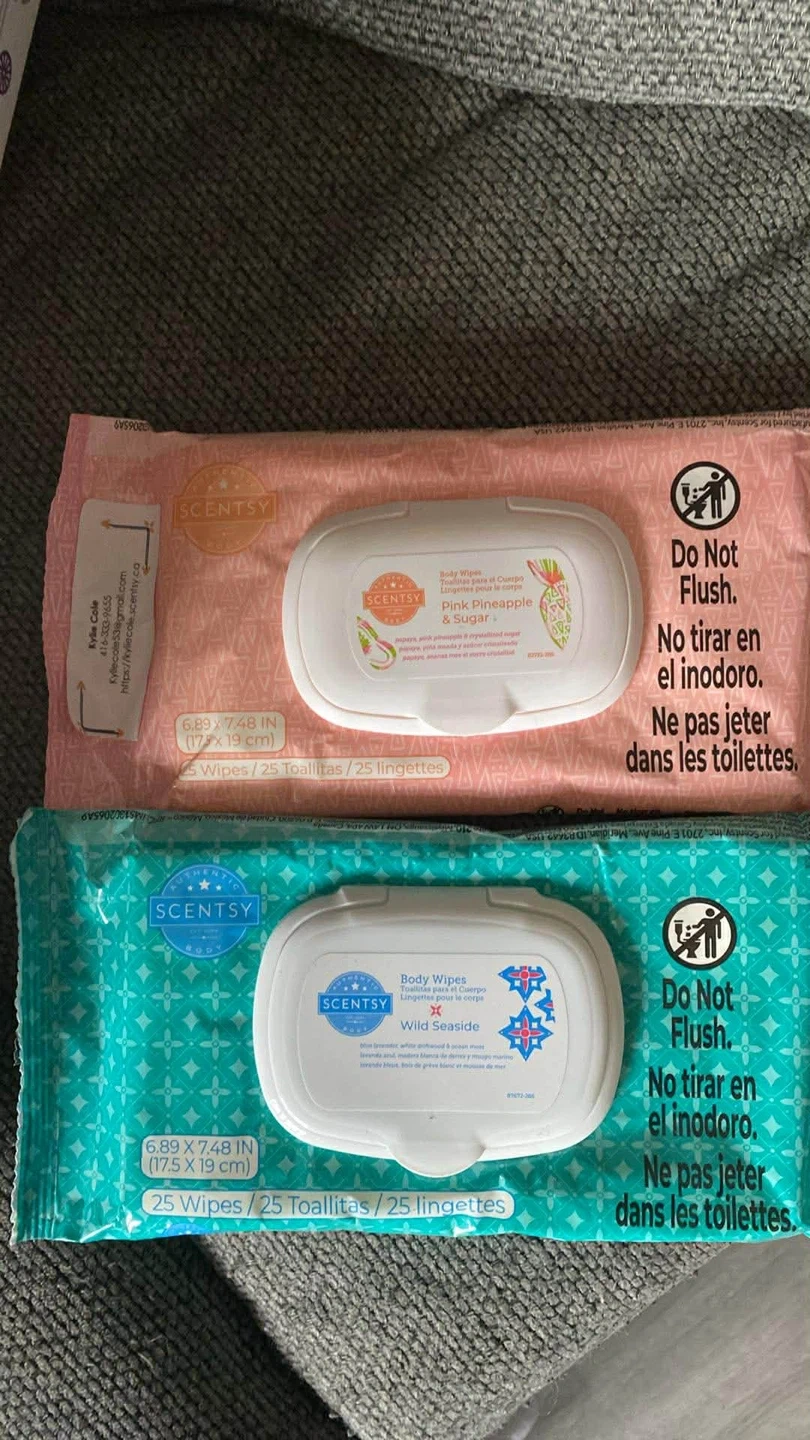 Selling two packs of Scentsy body wipes! One is Pink Pineapple & Sugar, and the other is Wild Seaside. Each pack contains 25 wipes and the dimensions are 6.89 x 7.48 inches (17.5 x 19 cm). Great for freshening up on the go! Have 2 of each $15 each Pick up only Park and Gibb Oshawa