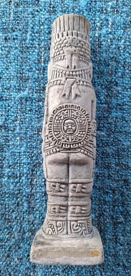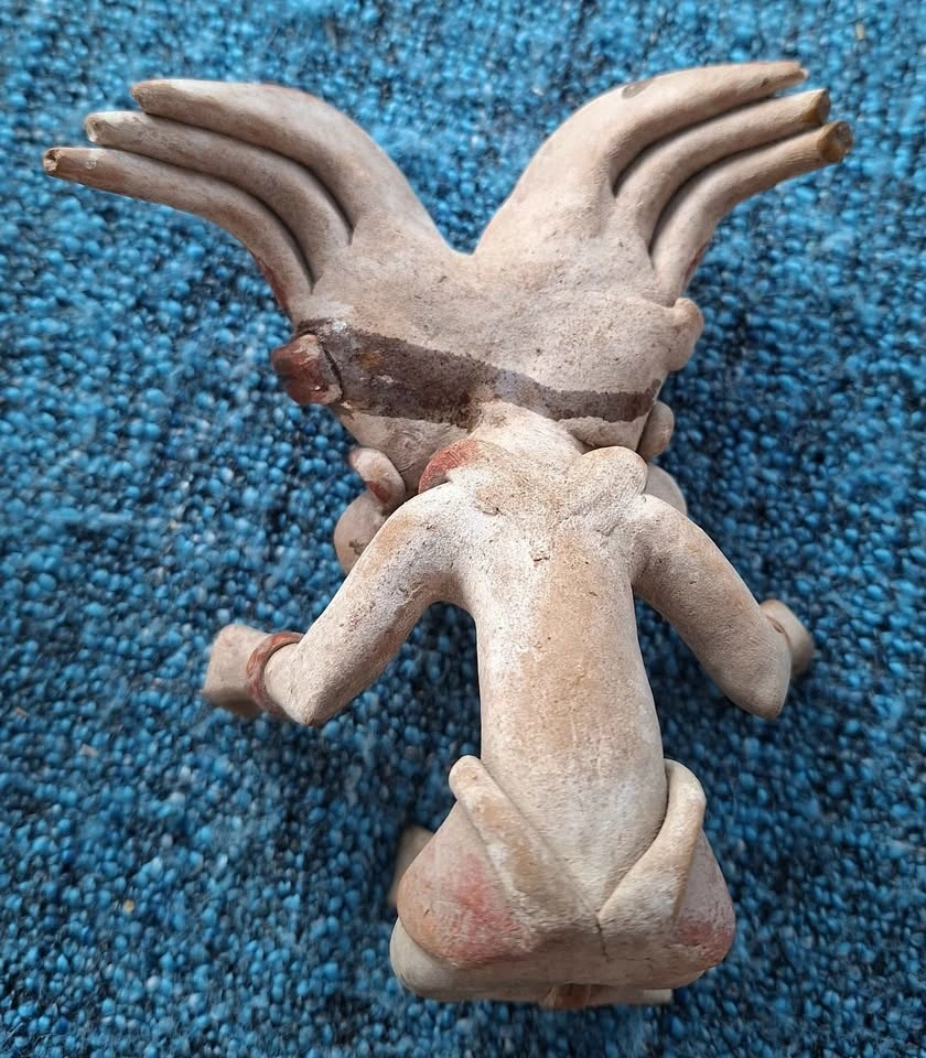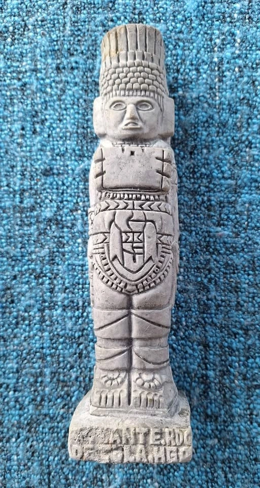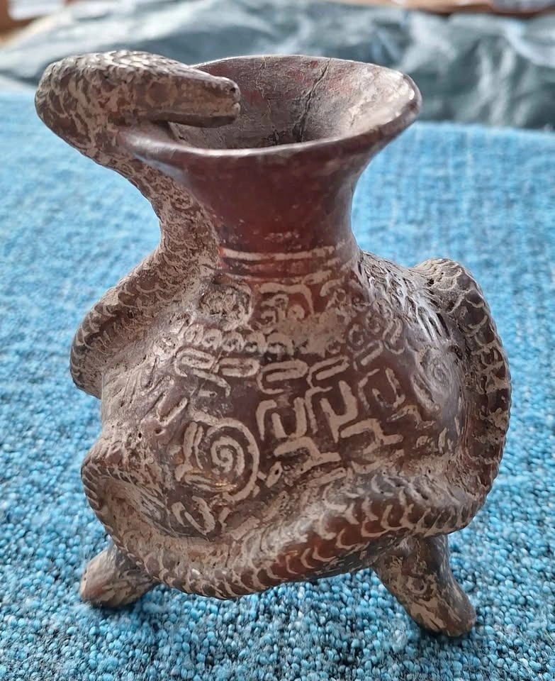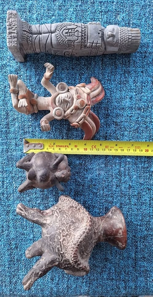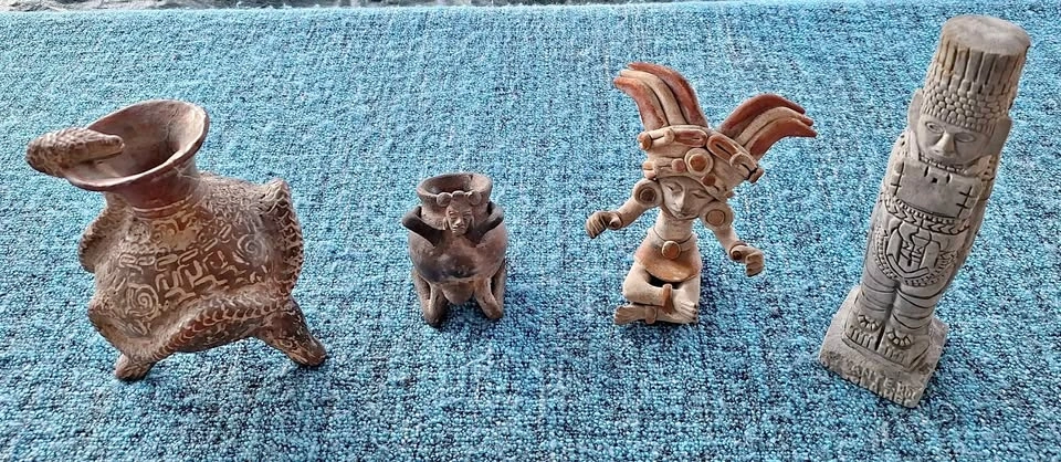 Unique set of 4 ceramic art pieces with an ancient, possibly pre-Columbian inspired style. Includes a vessel with a snake, a small pot with a face and arms (missing feet), a sitting figure with an elaborate headdress (1 broken thumb), and a tall carved statue. Made of clay. Great for home decor.