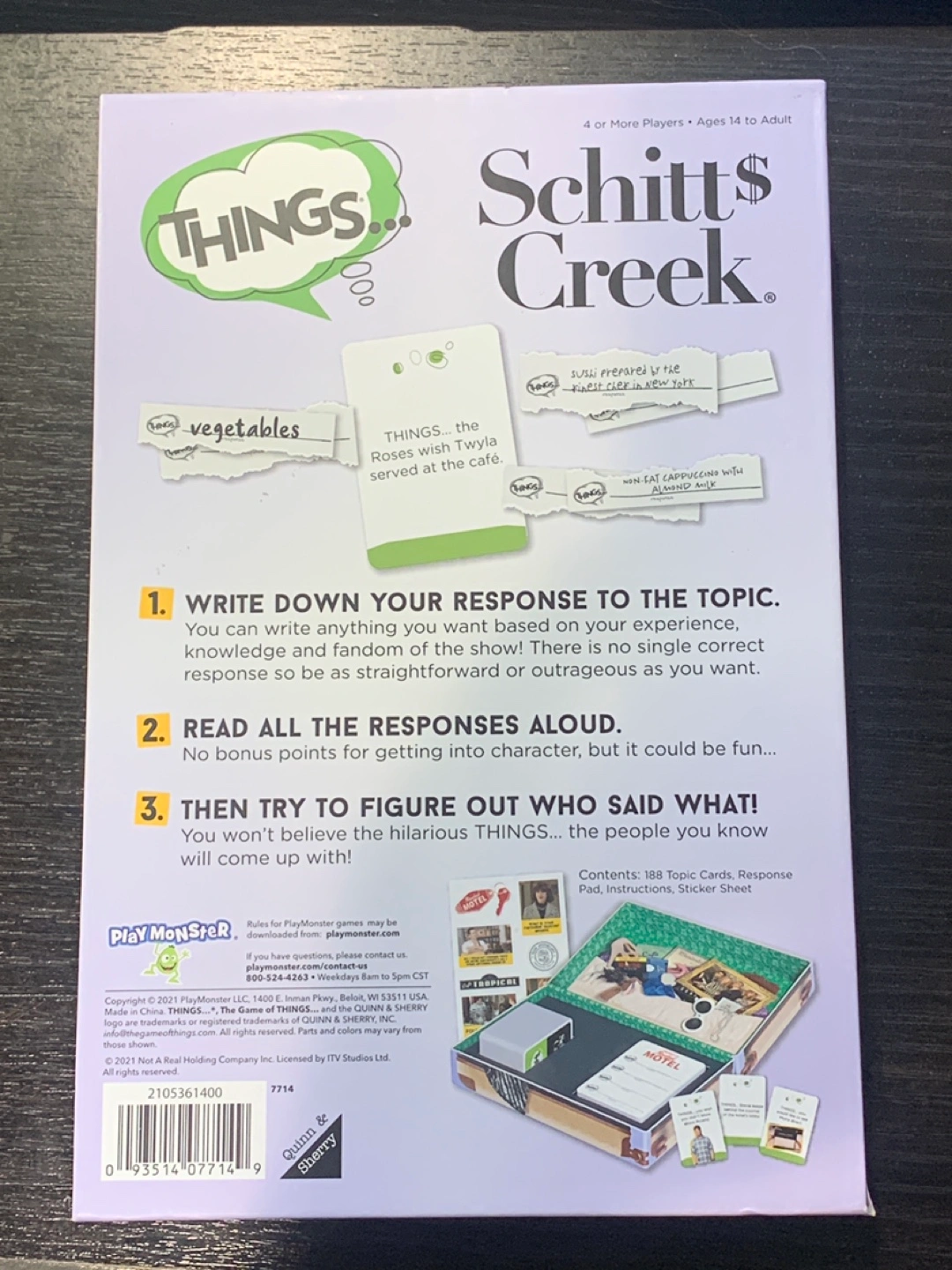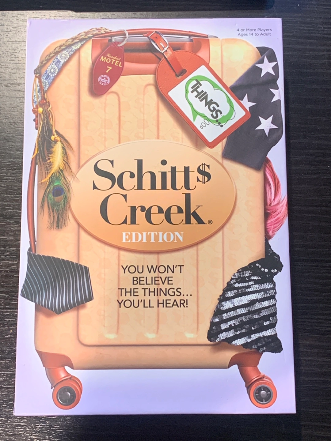 Selling a Schitt's Creek Edition of the THINGS... game! It's perfect for 4 or more players, ages 14 to adult. You won't believe the THINGS... you'll hear! Comes with 168 Topic Cards, Response Pad, Instructions, and a Sticker Sheet