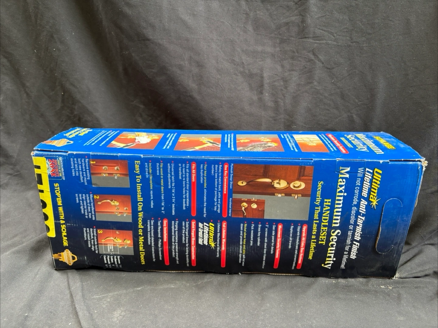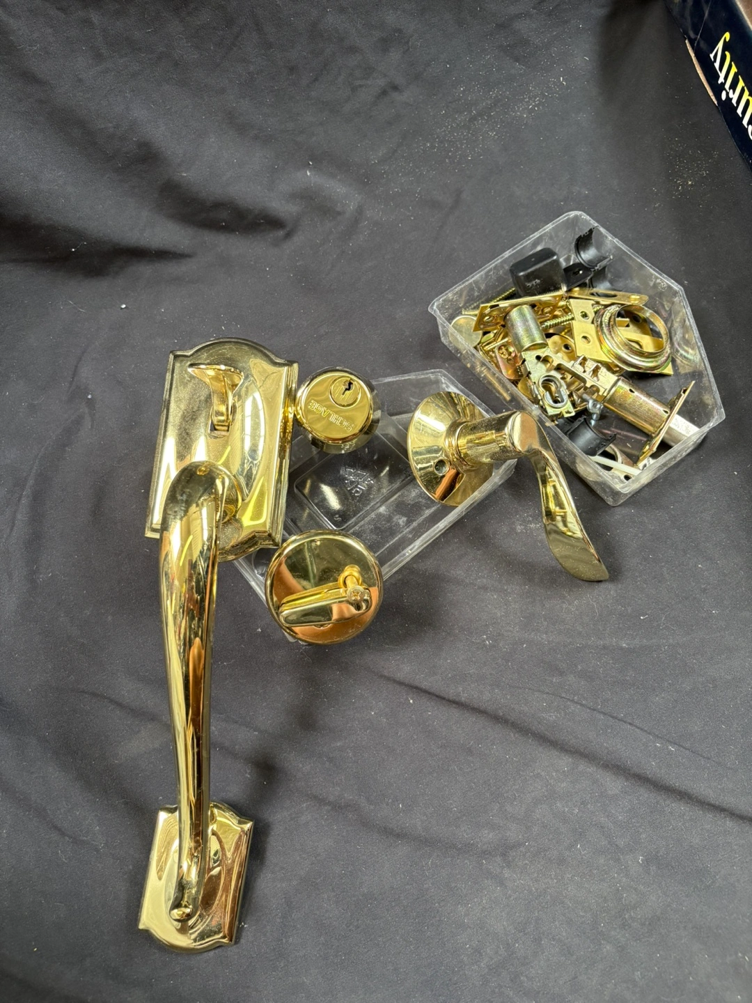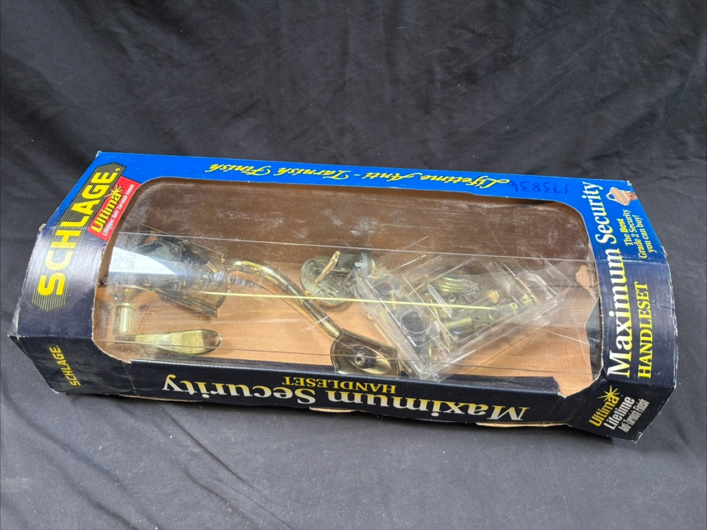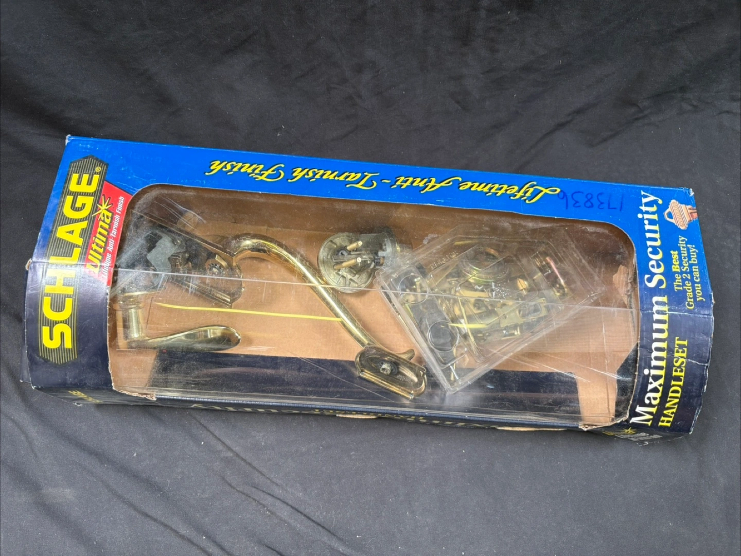 okay condition Schlage Maximum Security Handleset - Brass Selling a Schlage Maximum Security Handleset in brass finish! This handleset offers a lifetime anti-tarnish finish, ensuring it will not corrode, discolor, or tarnish for a lifetime. (In original box but all pieces are loose was installed but changed mind so took off-Price reflect-) $5 Pick up Victoria park & O’Connor area