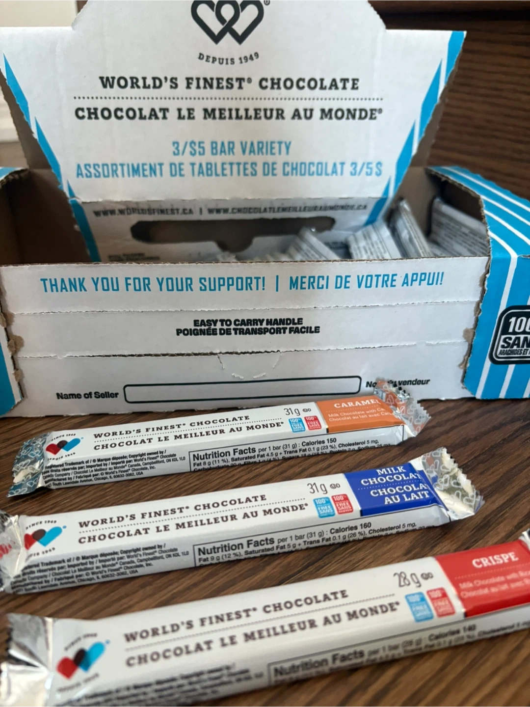 Selling a variety pack of World's Finest Chocolate bars! Includes caramel, milk chocolate, and crispe flavours. Perfect for a little treat, to hand out a Halloween or sharing with friends. Each bar is individually wrapped. All $$ goes to my son’s school fundraiser