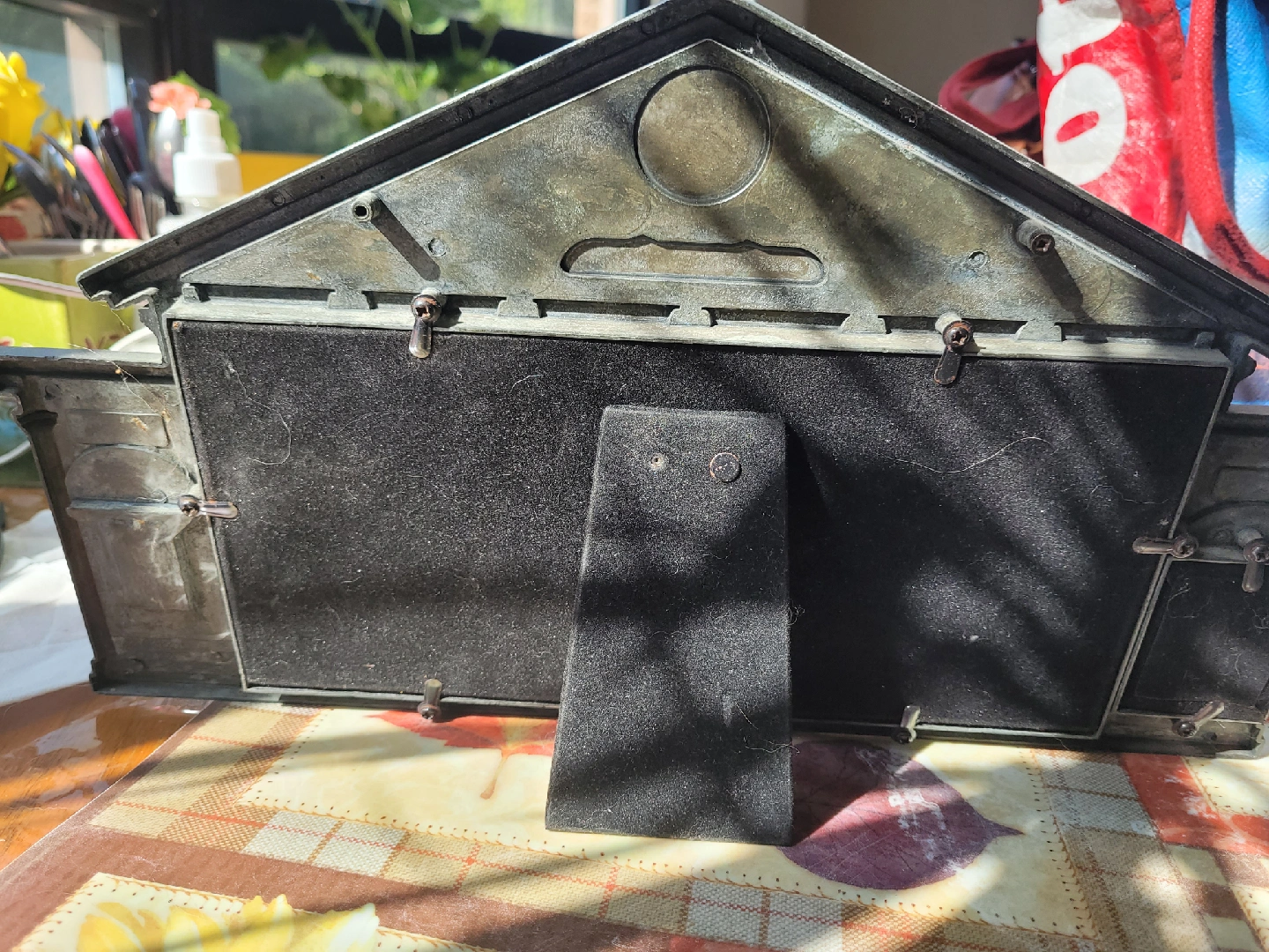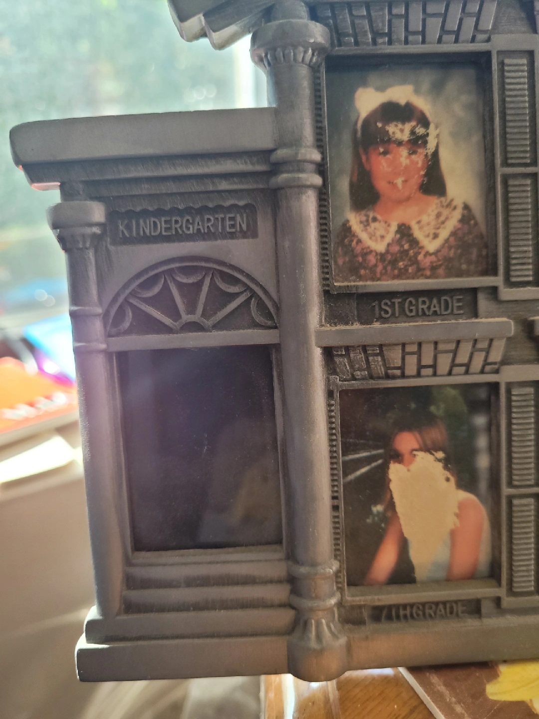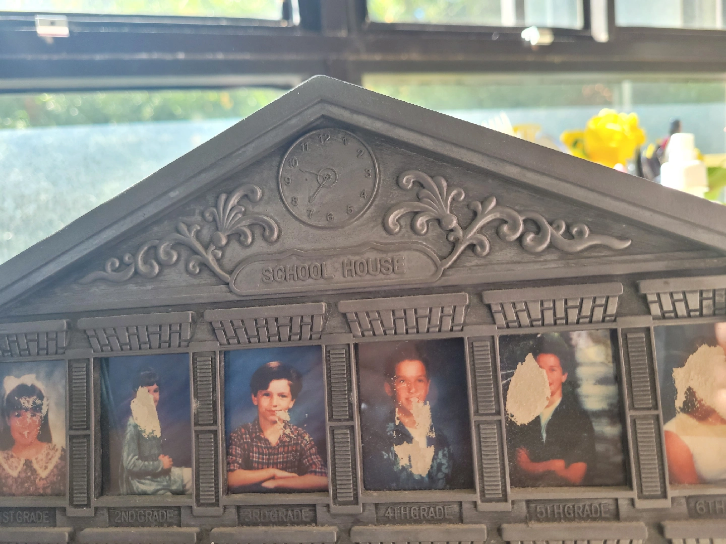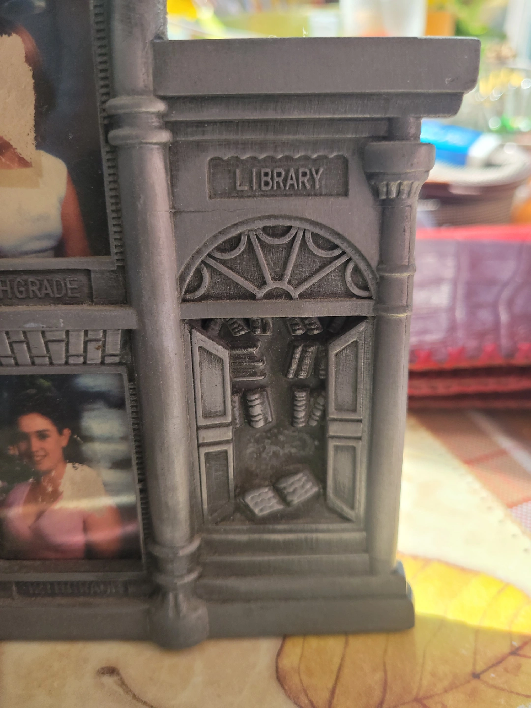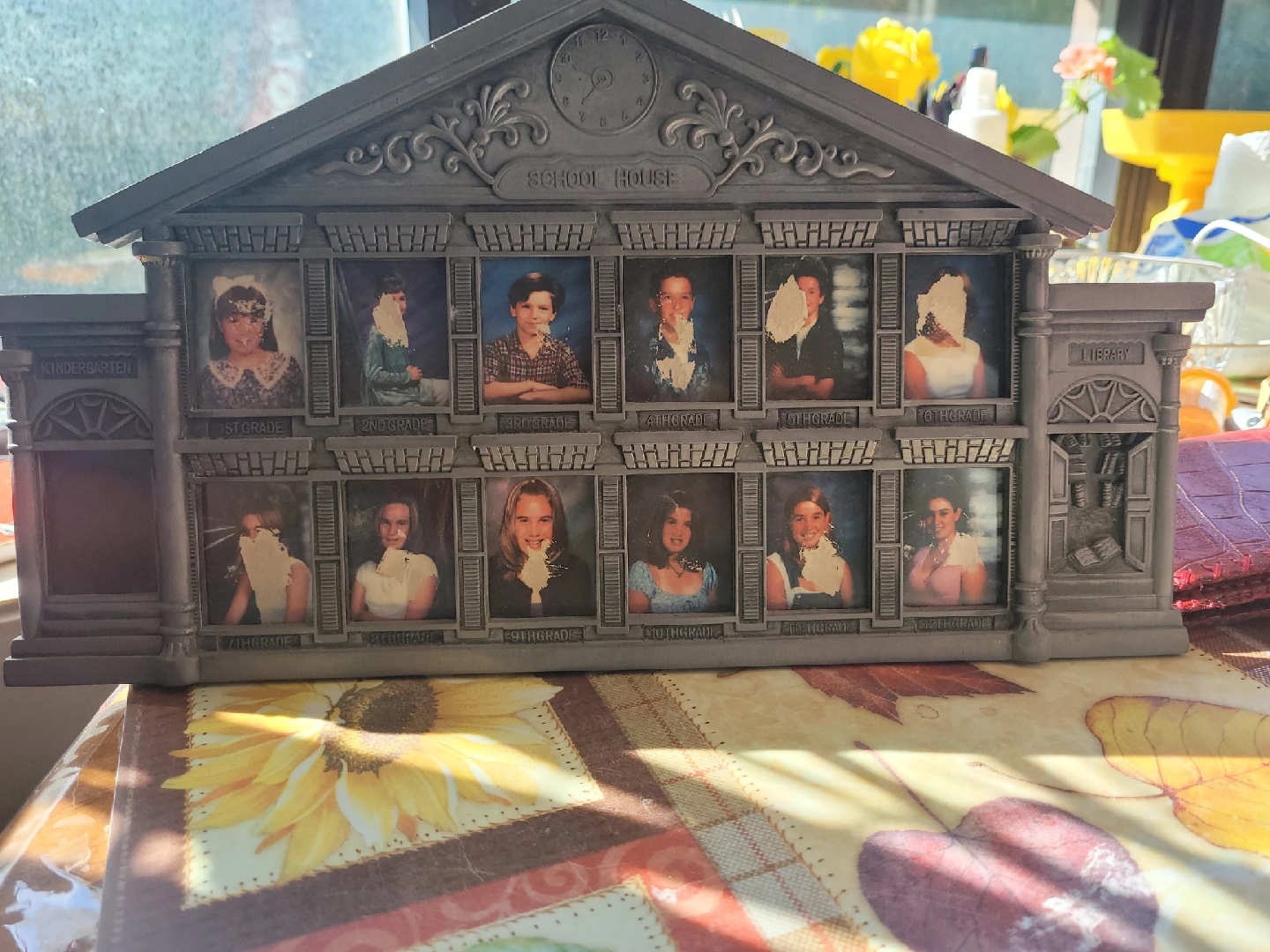 Here's a unique school house picture frame! It has slots for photos from kindergarten to 12th grade, plus a library detail on the side. A fun way to display school memories