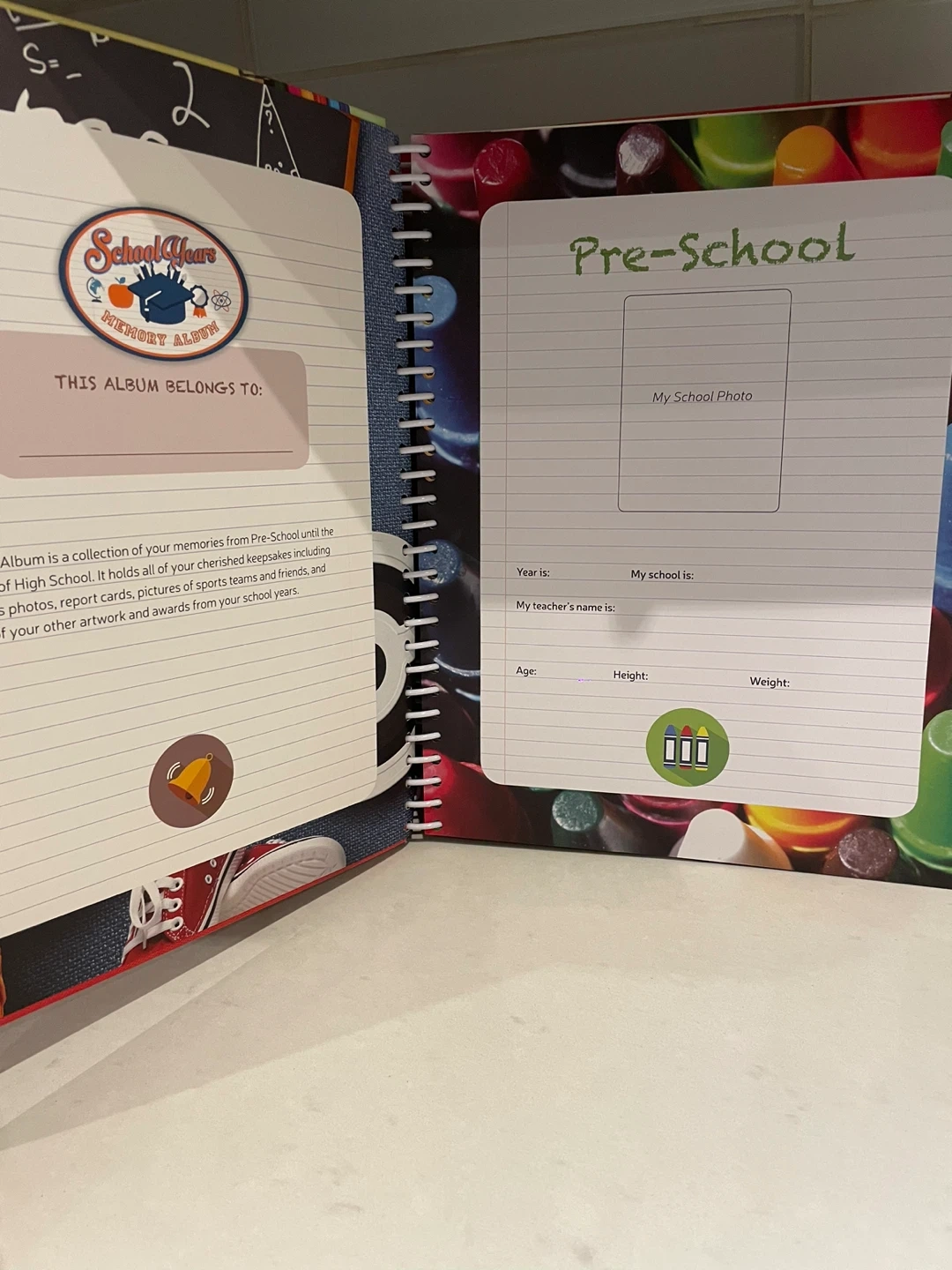 Save and organize all of your child's cherished school memories from Pre-School through Grade 12 with this memory album! It holds all of your cherished keepsakes, including school photos, report cards, pictures of sports partners and friends, and all of your other artwork and awards from your school years