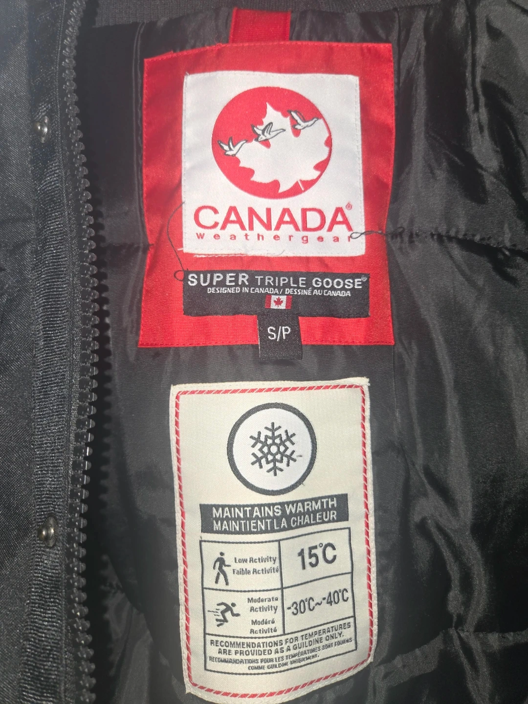 Canada Weather Gear Super Triple Goose parka in size small! This black parka is designed in Canada and maintains warmth. Perfect for low to moderate activity in temperatures ranging from 15°C to -30°C/-40°C