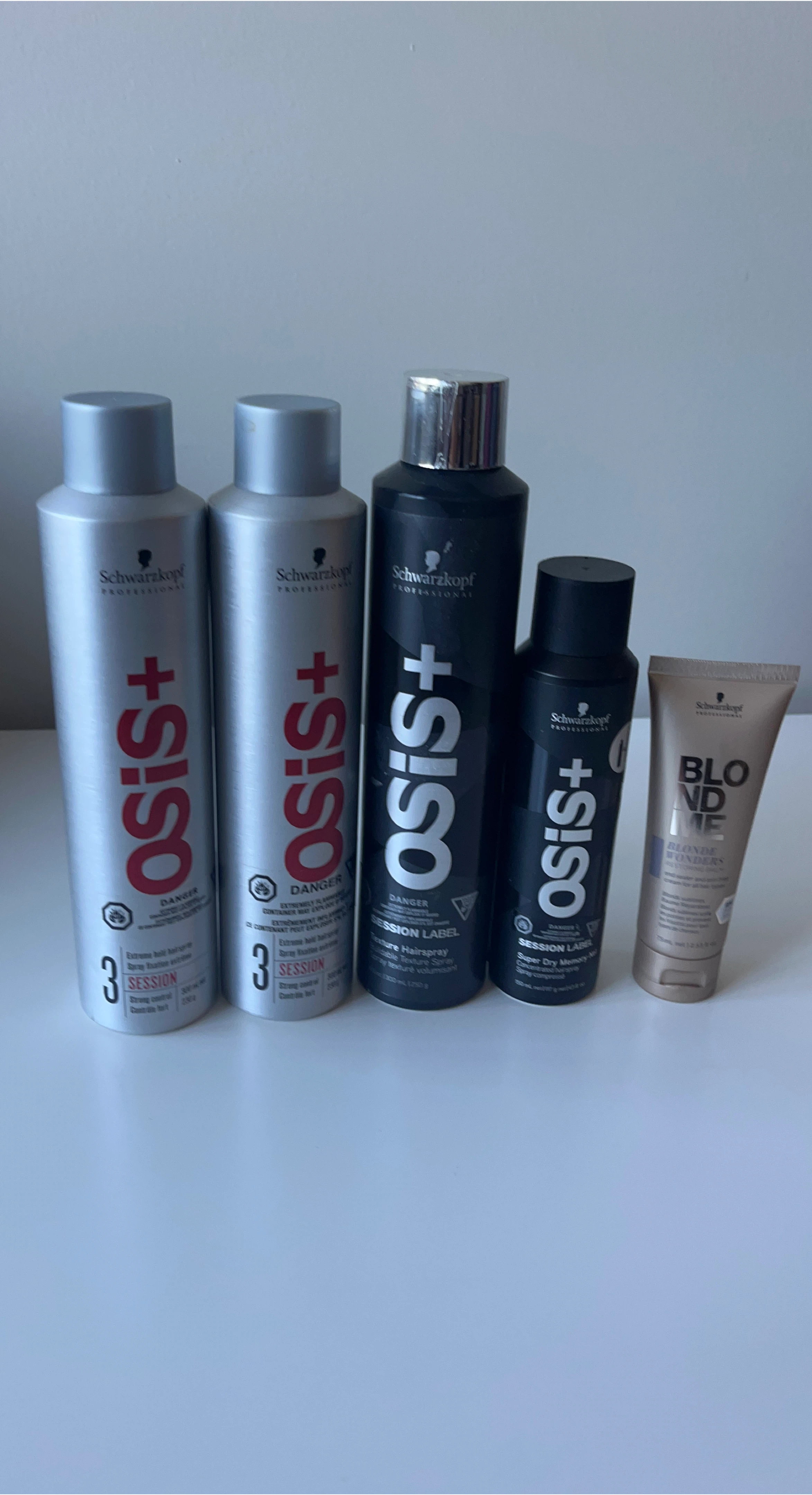 10Selling a collection of Schwarzkopf Osis+ hair products! Includes: - Two Osis+ Session Hairspray (level 3) - One Osis+ Session Label Texture Hairspray - One Osis+ Session Label Super Dry Memory Net - One BlondMe Blonde Wonders These are great for achieving different hair styles and textures