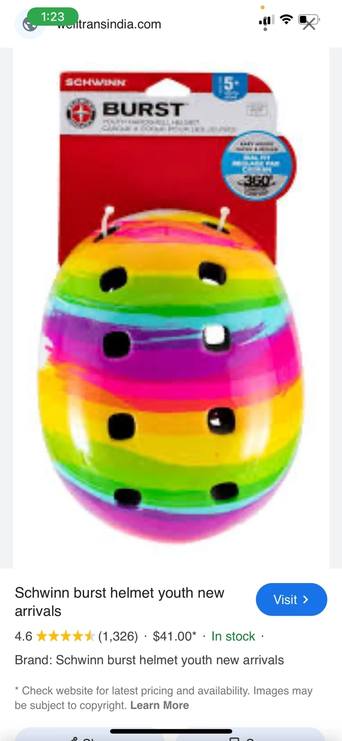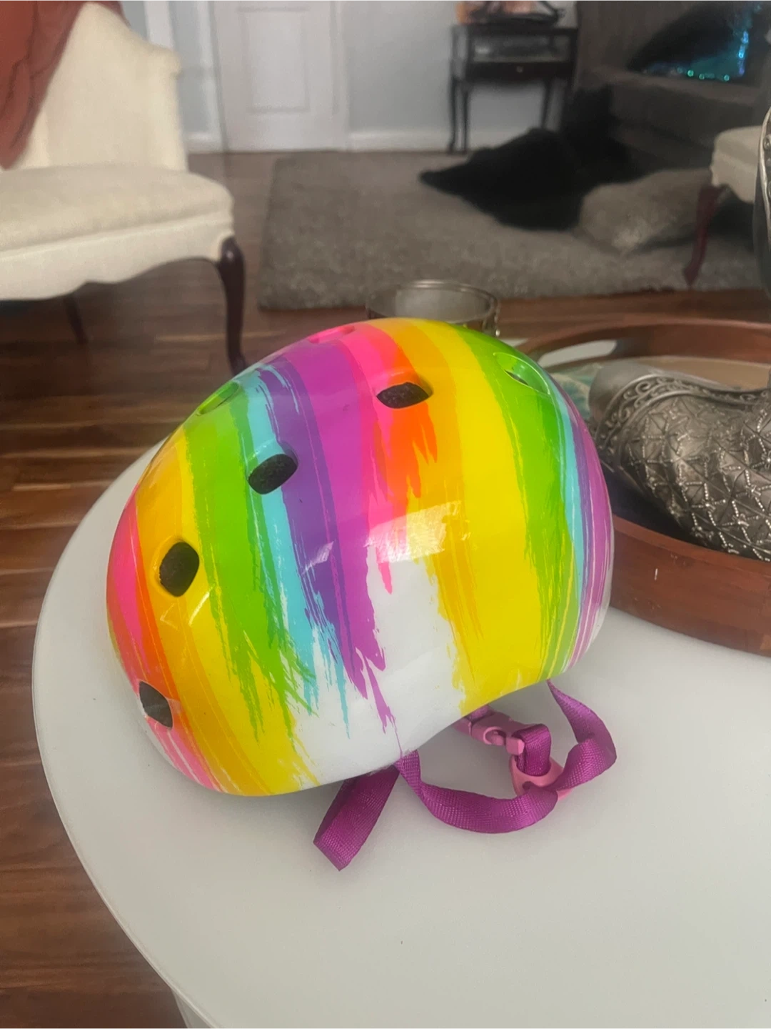 Selling a Schwinn Burst youth helmet in a fun multi colour. It's perfect for biking, skating, or scootering. This helmet is designed to provide safety and comfort for your child during outdoor activities. It has a snug fit and is easy to adjust. It's in great condition and ready for a new owner!