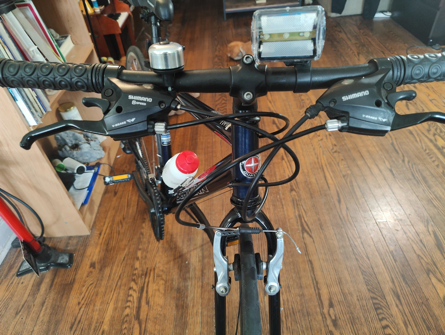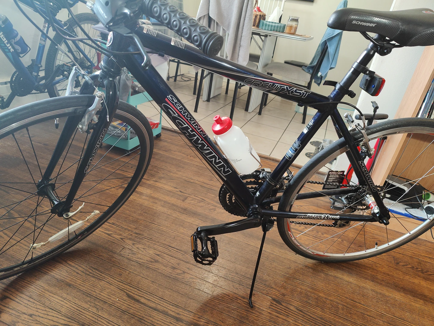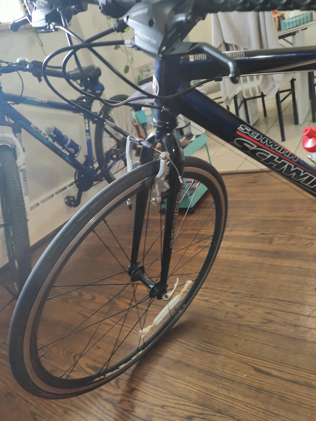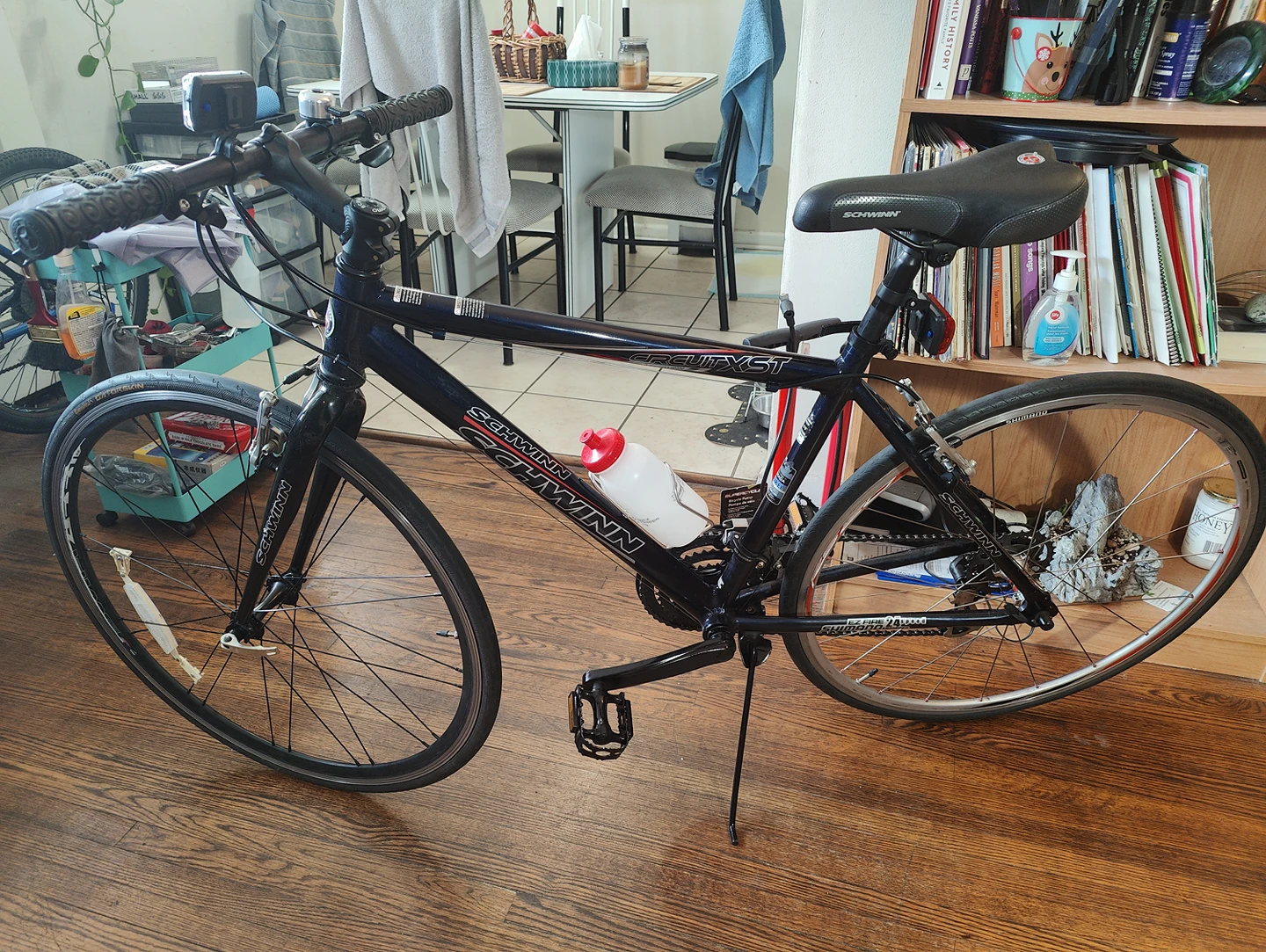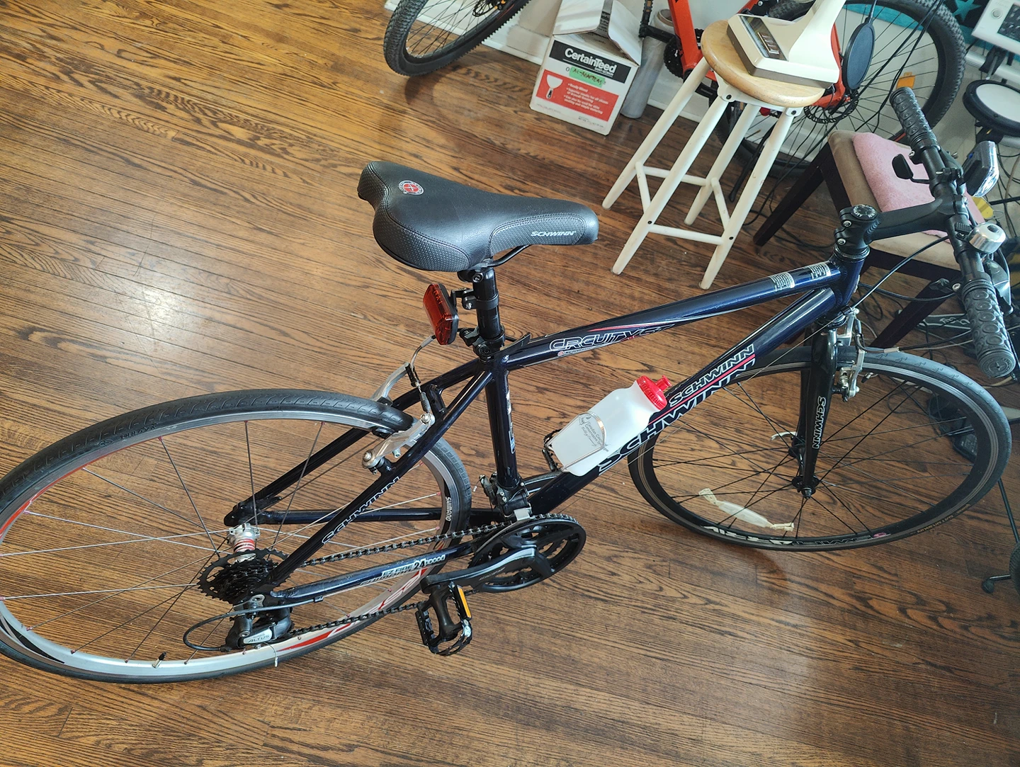 160Schwinn Circuit hybrid bike in excellent condition, frame 18", wheels 700cc. It fits with 5'5"-6" riders. Bike is in near mint condition, no rust, no scratches, freshly tuned up and serviced, 18" aluminum alloy frame. Tires in very good condition. 24 speed gearset, everything works as it should! Very nice, light weight, solid and well riding bicycle. Needs nothing to ride! Equipped with Shimano Arius derailleur and Shimano V-Brake - Shifters Combo, bottle with holder, front and rear battery lights and bell. ::::::: I am at M3H 4N9, Toronto. Finch and Dufferin is my closest intersection.