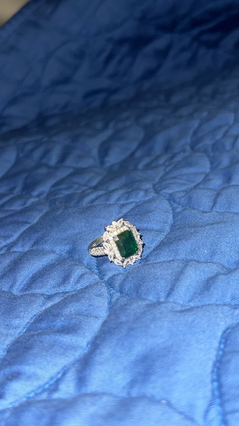 Selling an elegant emerald ring. The ring features a beautiful green emerald stone surrounded by sparkling details. It's perfect for adding a touch of sophistication to any outfit