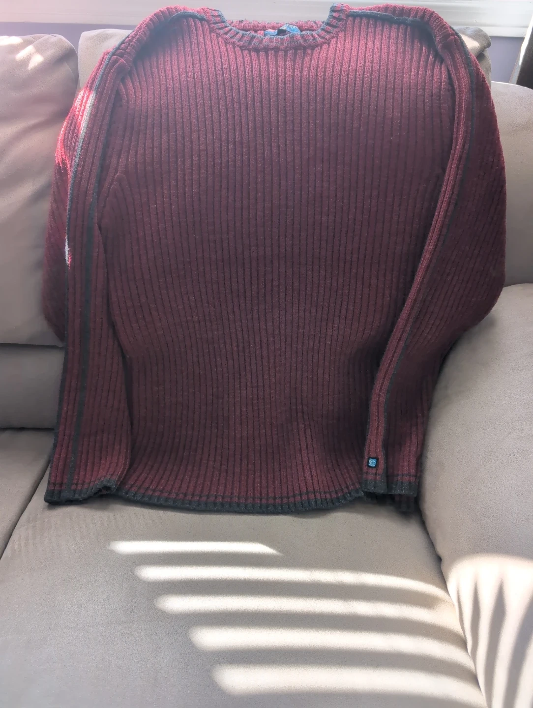 A maroon ribbed crew neck sweater. It features a contrasting dark grey trim along the neckline, cuffs, and hem. This sweater's knit design offers a textured look and feel.