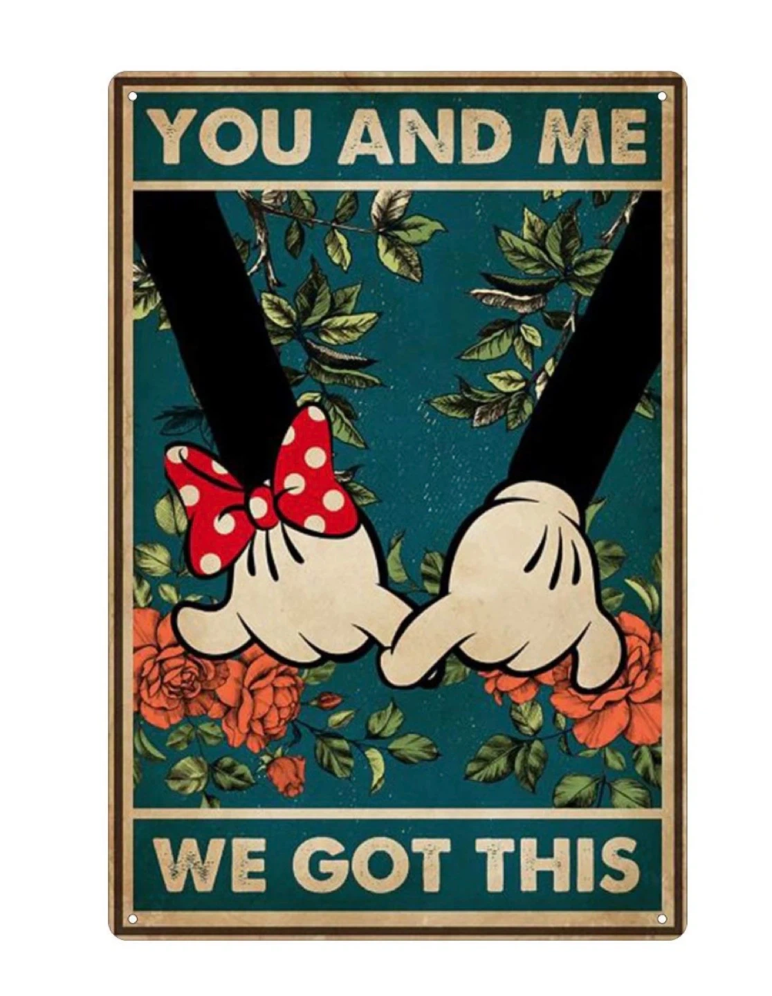 This is a metal sign featuring Mickey and Minnie Mouse holding hands. It has the text "YOU AND ME WE GOT THIS" printed on it. The sign has a vintage look with floral elements.