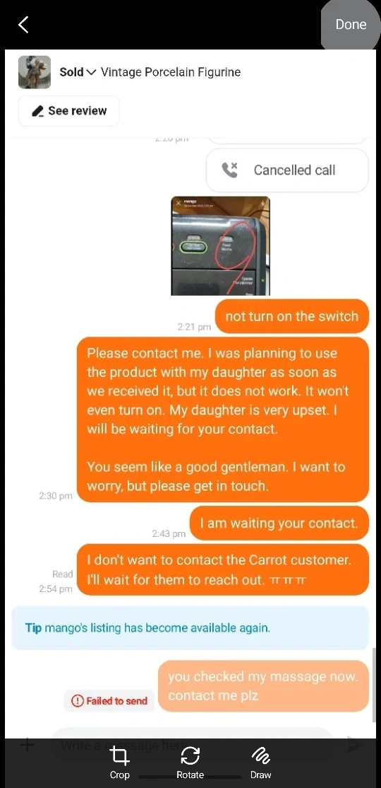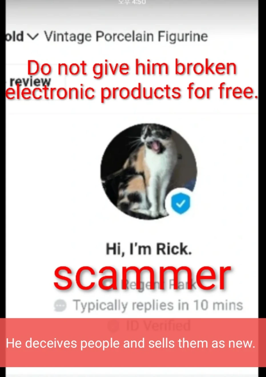 1000+I think this man purposefully scammed me and will continue doing so. He taped the broken item into a closed box so I could not check the quality. He said the items were new, but it was not working at all. I really do not think it was a mistake as he blocked me right after when I asked him about it. He is also currently deleting all of his information. His sales list has been deleted as well. I'm sad because I don't think I can trust buying things like I used to. I captured the conversation with him and posted it. He's a Caucasian guy in his between 60s-65s He is about 1.76-1.78 meters tall, thin, wears glasses, and brought Dolly. Another seller told me that he lives with seven cats. He is blocking and deleting people's reviews. I don't think it was a mistake. It seems like a professional scammer. Be aware! I hope no one else gets hurt. I will report to 🥕 carrot center. Description of our interaction: I often enjoy meeting and communicating with good people. This time was no exception, I shared free items and when I heard that he was coming from far away to pick them up, I purposefully bought one of his products. Its not really about the it wasn't about the money but more the bad intention. He was a caucasian man in his mid-60s, and I was hurt by his actions of breaking trust over a amount of money. I don't think this was a mistake. He professionally collects free items. (Over 99% of the items on his review list were obtained for free.) The reason the reviews scored high is also because they pretended to be kind and took free items. I learned a lesson from Carrot that it is safe to buy things from sellers who do a lot of sales. ------------------------------------------------------------------------------------------ In short: I uploaded the Vintage Porcelain Figurine on Carrot for free with good intentions. Rick contacted me and said he would get two for free. Because I appreciated him coming from far away, I decided to purchase one of the items Rick was selling, a food saver. While he took the Figurine I uploaded for free, he gave me this food saver. 5 minutes after purchasing the item I tried to use the product, but it didn't work. It was already a broken item. it doesn’t turn on at all. So I sent a text message, but he ignored it and has not contacted me. I want to connect with the person who bought an item from him and also with Carrot customer service. Please contact me.