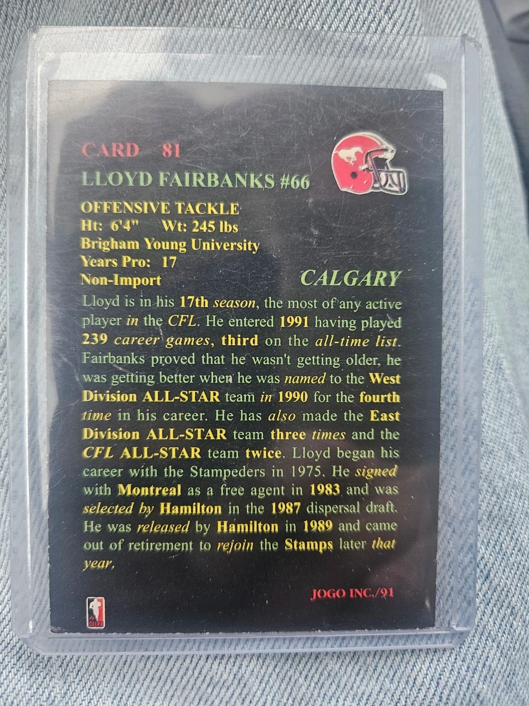 Selling a Lloyd Fairbanks #66 Stampeders card. It's signed and in great condition! The card is from JOGO INC./91. He played Offensive Tackle, standing at 6'4" and weighing 245 lbs. He played 17 years professionally and was named to the West Division ALL-STAR team in 1990