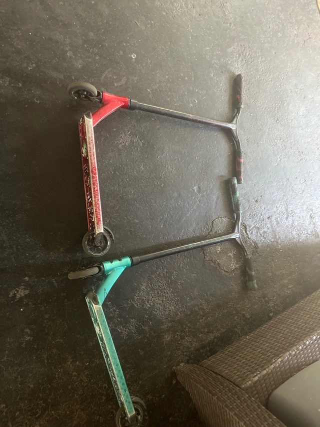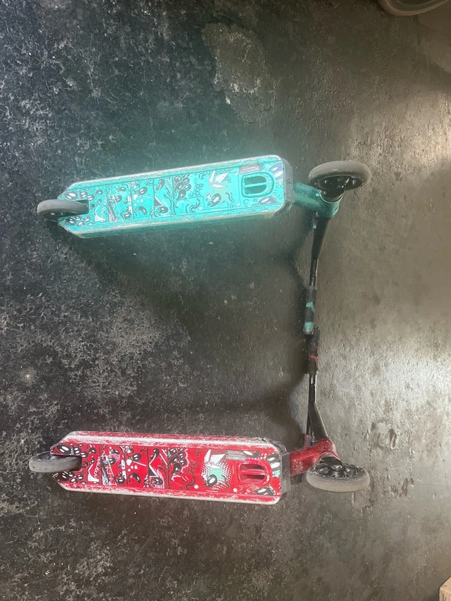26Selling two used pro stunt scooters in good working condition. Both have solid decks, strong bars, and smooth-rolling wheels. Normal cosmetic wear from riding (scratches and paint wear), but structurally sound. • 1x Red & Black scooter • 1x Teal & Black scooter • Great for skateparks, tricks, or just cruising around • Selling as a pair – $80 for both Perfect affordable upgrade or spare set for kids