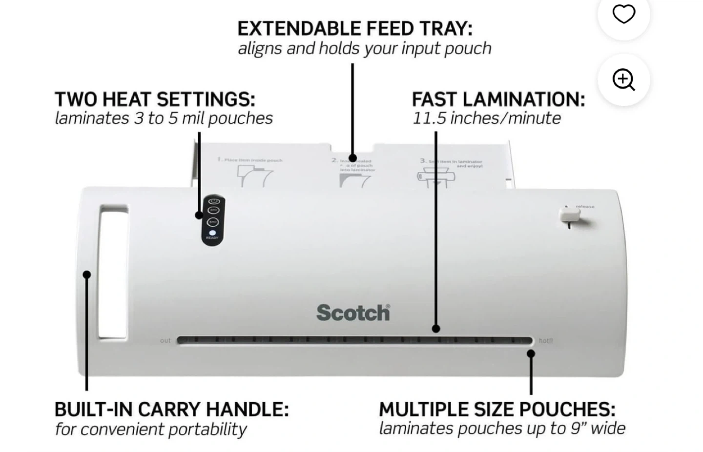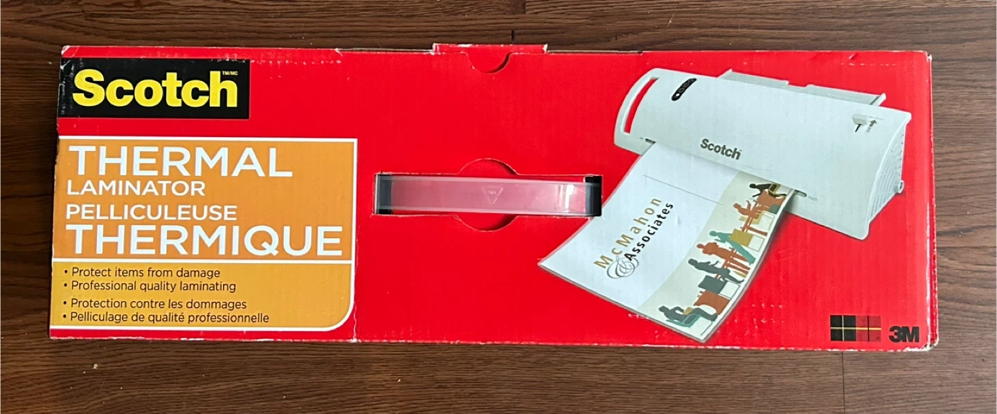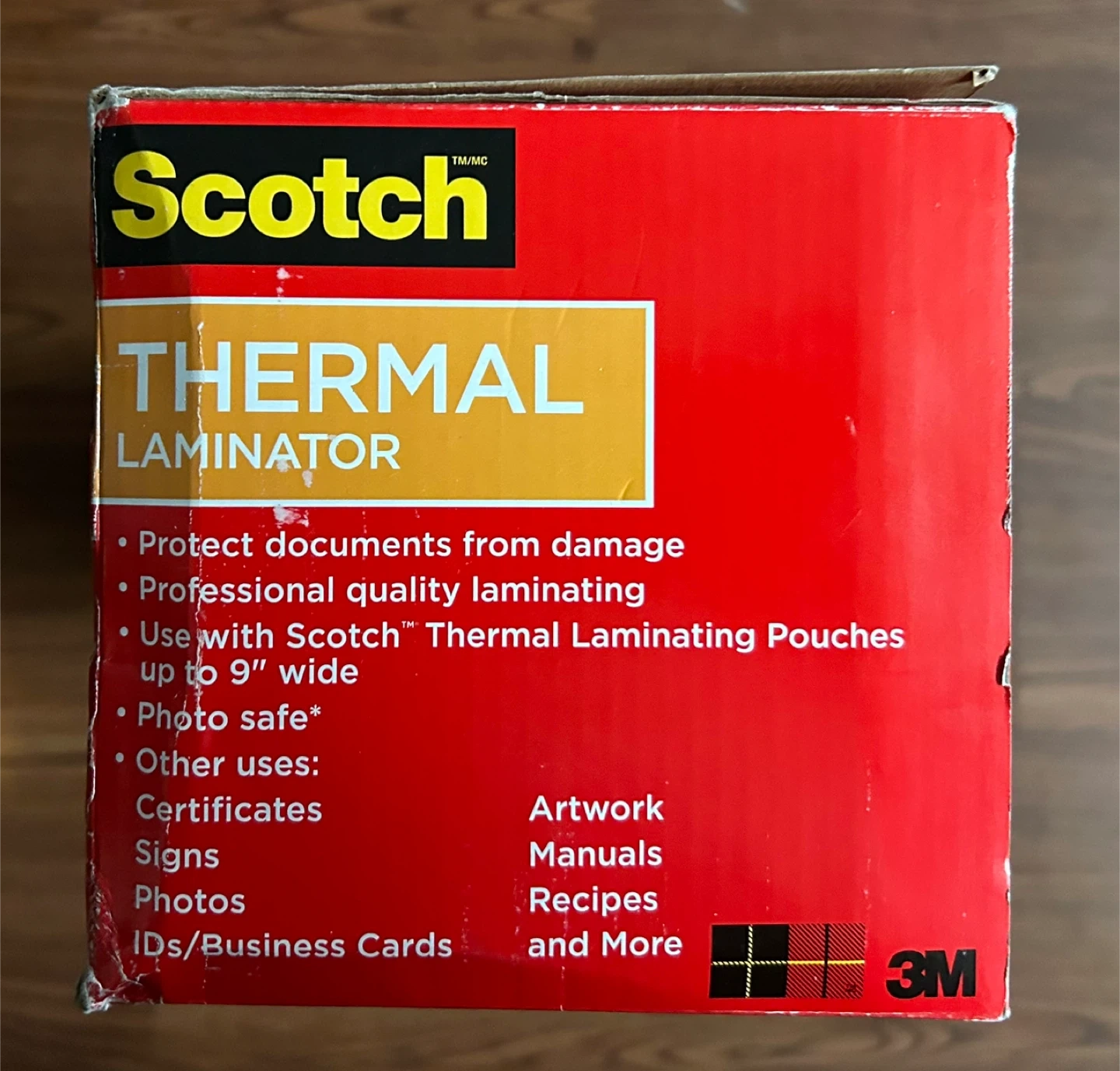 212Selling a Scotch Thermal Laminator in Brand new condition! It protects items from damage and offers professional quality laminating. It uses Scotch Thermal Laminating Pouches up to 9" wide. Also great for artwork, manuals, recipes, photos, IDs, and business cards. Comes with two 8.5" x 11" laminating pouches and built-in cord storage.