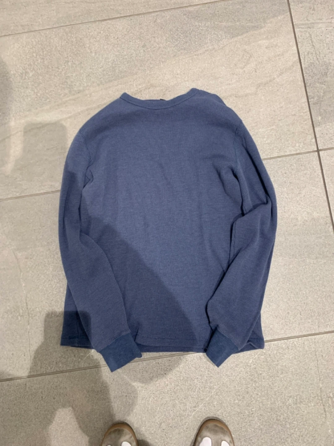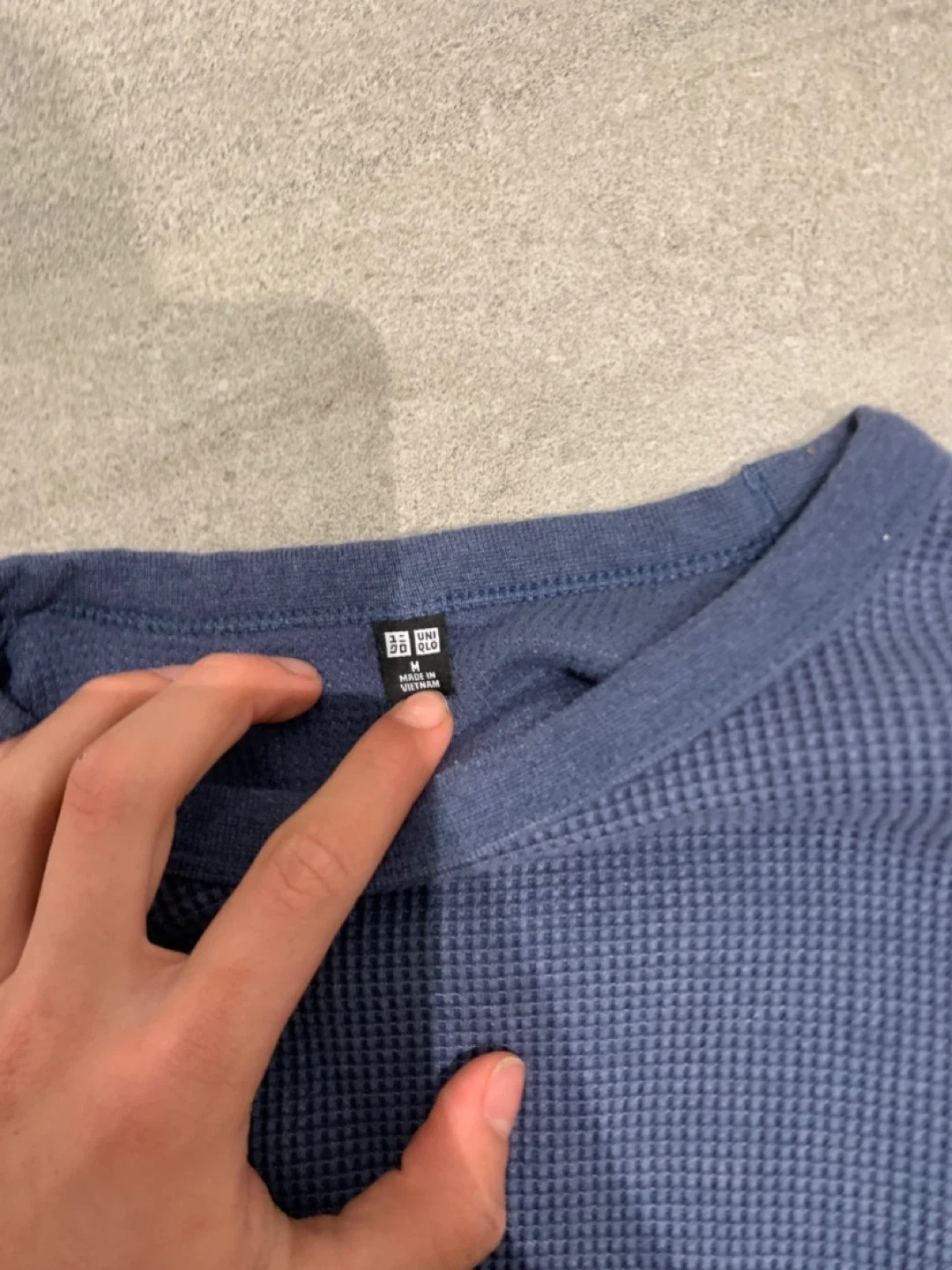 This is a Uniqlo long sleeve thermal shirt in blue. It's a waffle knit style. Size is M