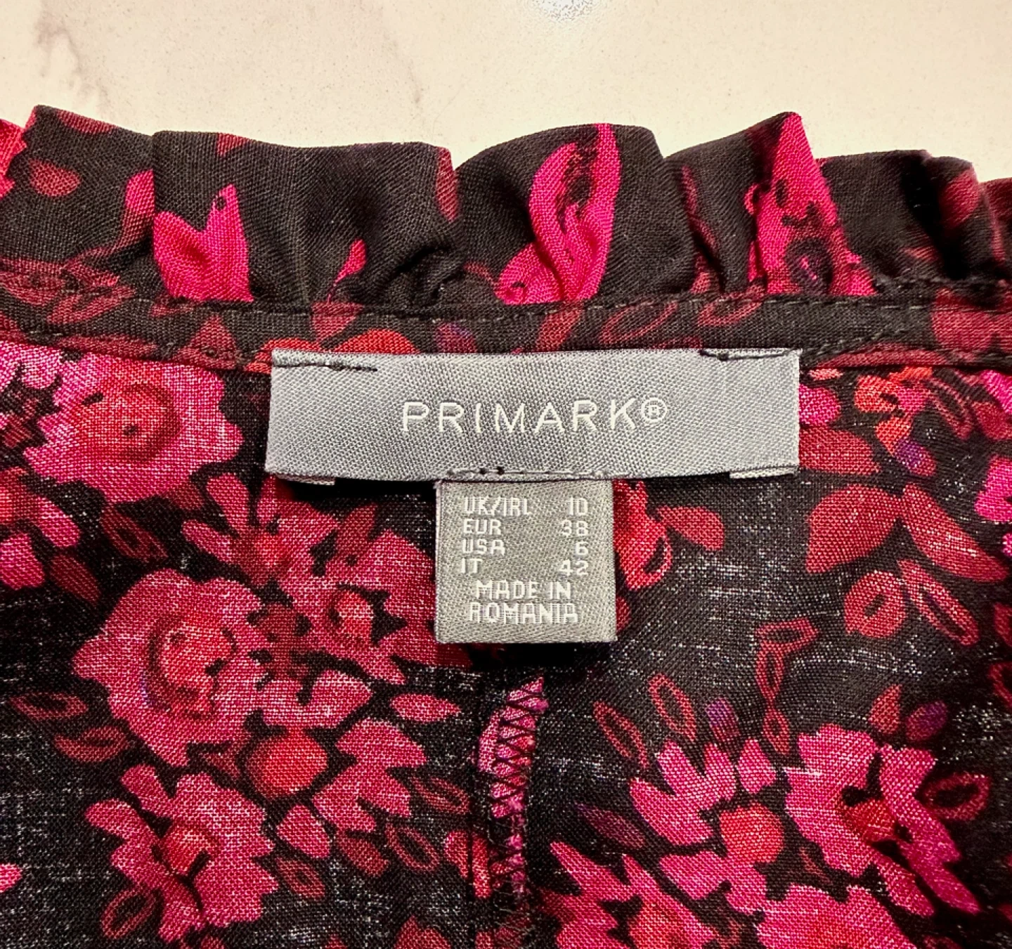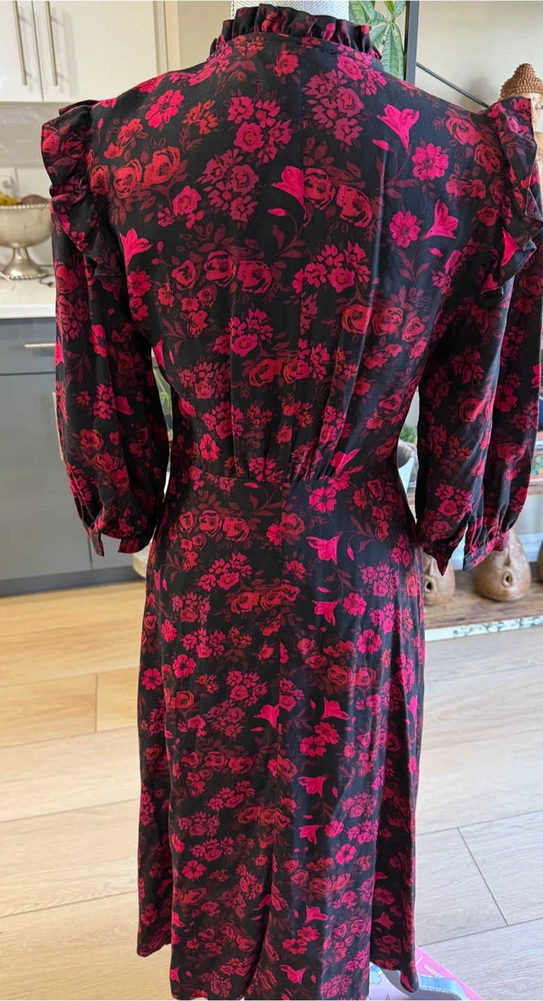 A black midi dress by Primark featuring a vibrant floral print in shades of pink and red. It has a button-up front, long balloon sleeves, and ruffled details on the collar and chest. Size is UK 10.