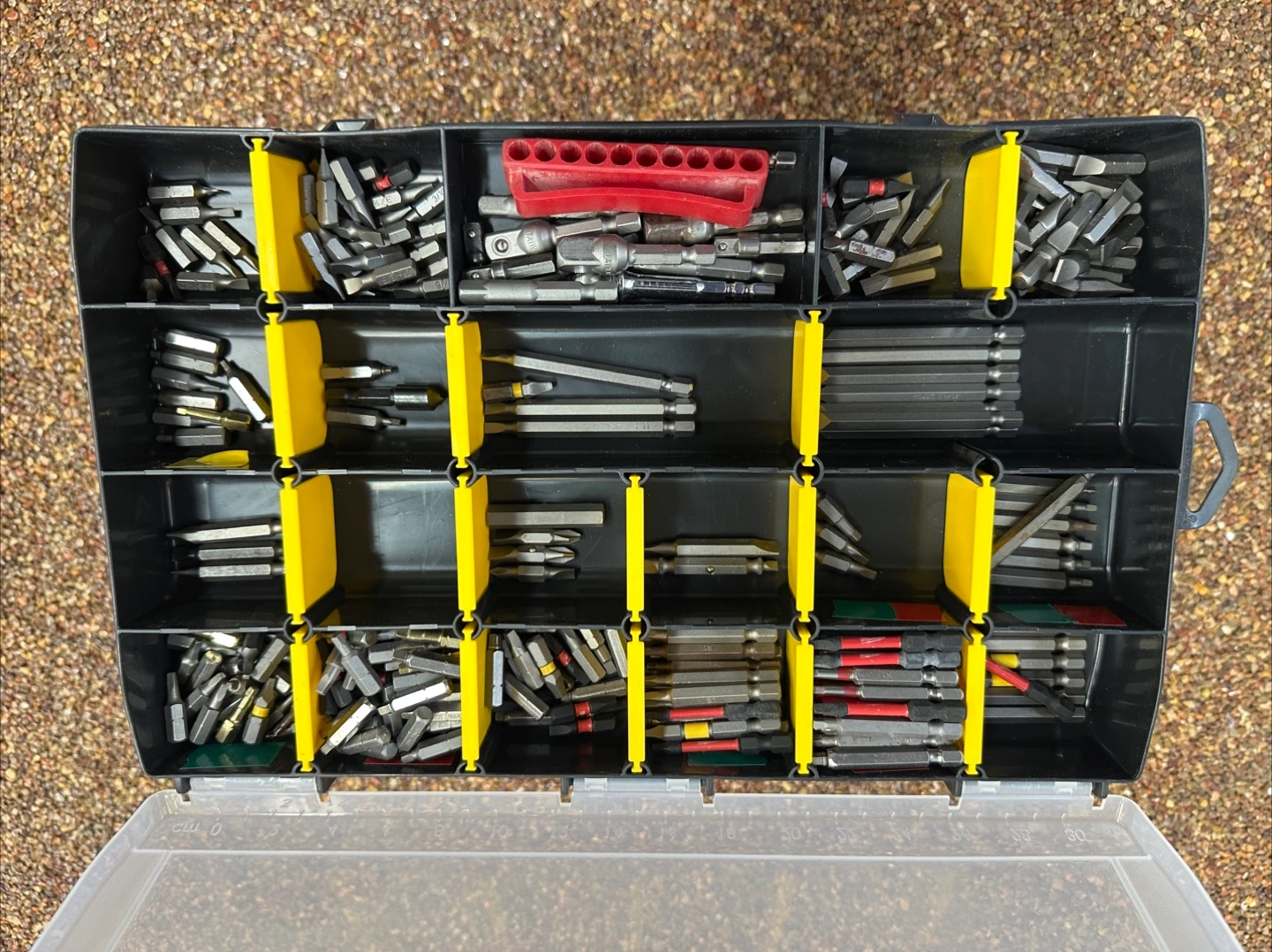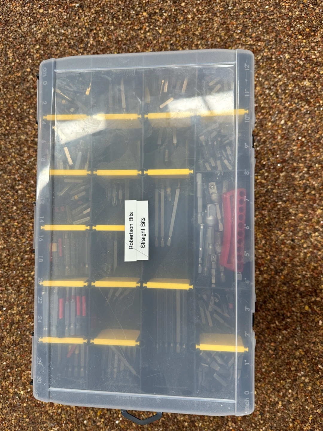 Selling a 1/4” bit set. Comes with 5 cases to keep everything organized and easy to find. 1 box of Robertson bits in various sizes, 1 box of Slitted bits in various sizes, 1 box of TORX bits in various sizes, 1 box of Phillips bits of various sizes, 1 box of Nut Driver bits of various sizes.