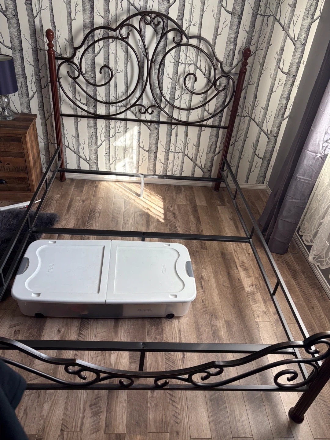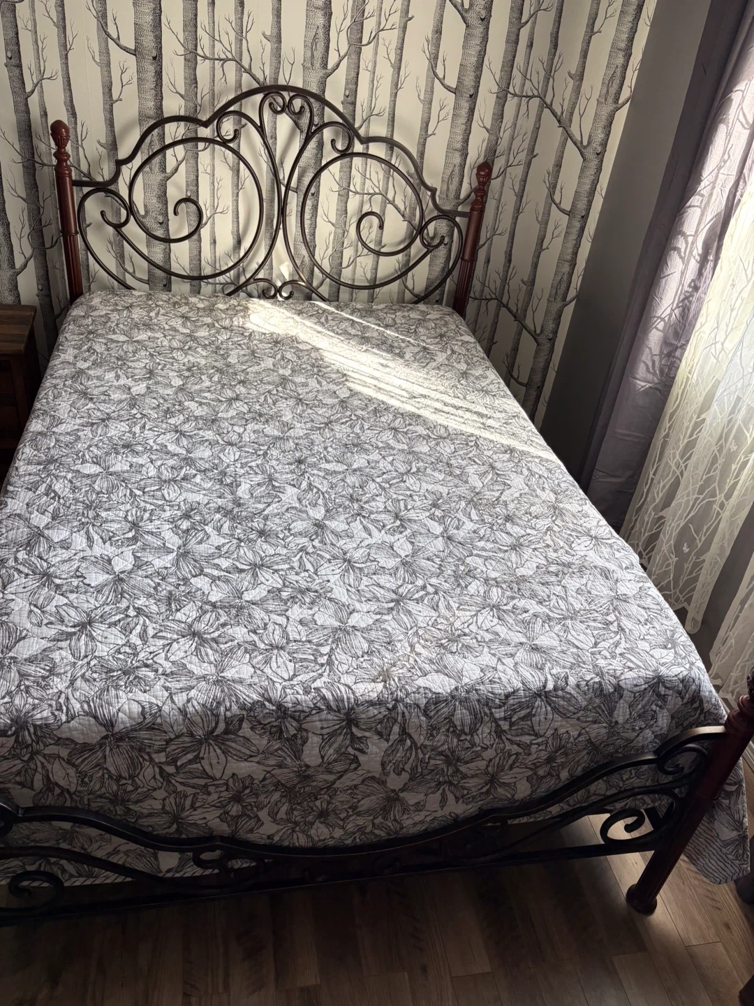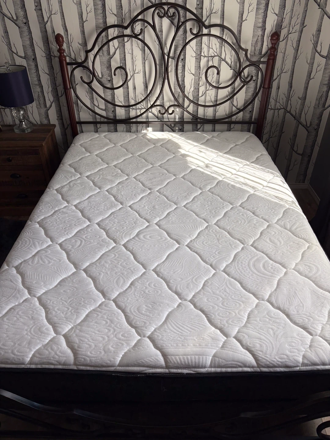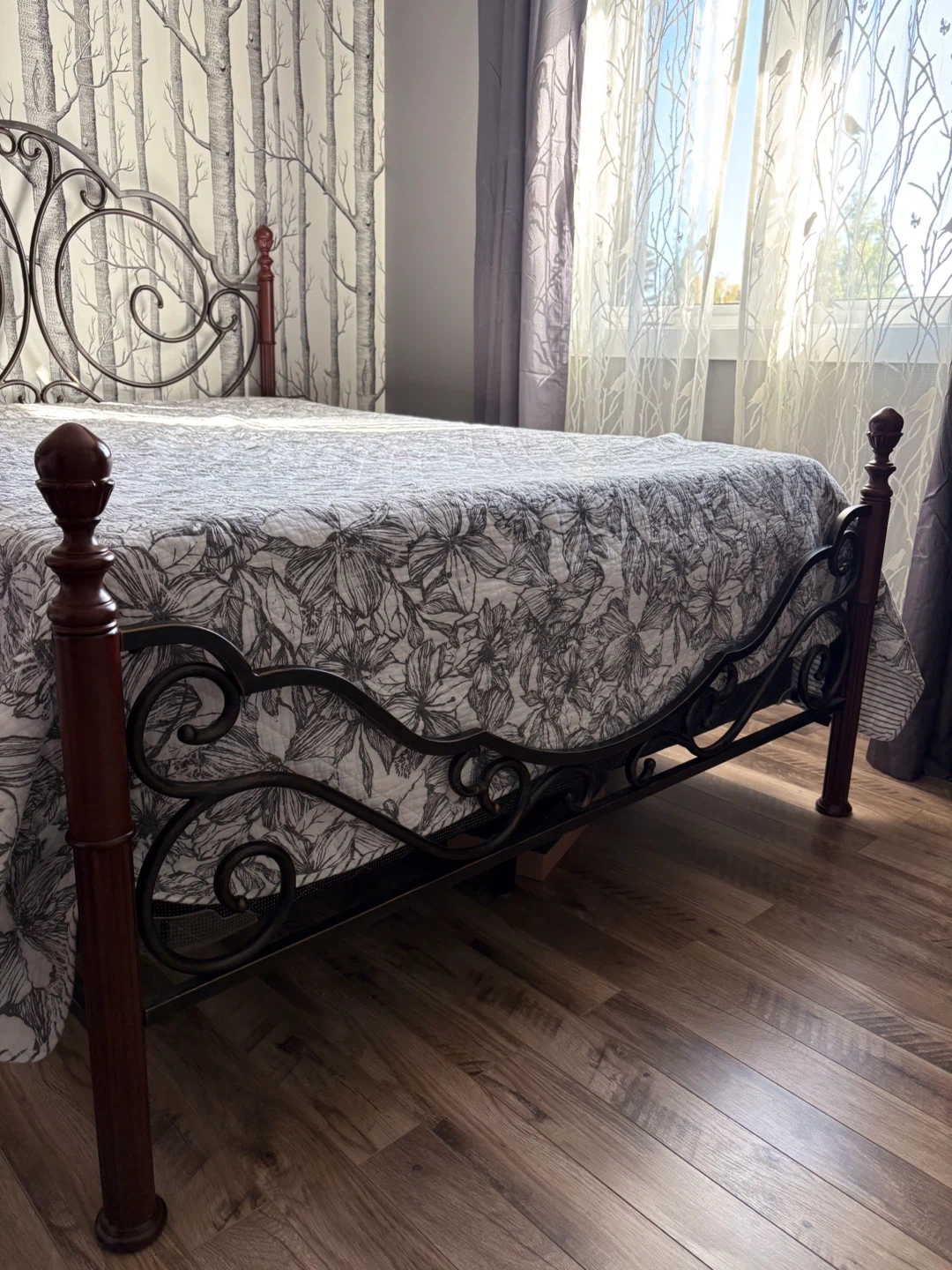 Selling a beautiful double/full scrolled work metal bed frame and mattress. It features a brown and black finish with a decorative headboard and footboard. In like new condition, used in spare bedroom. Needs a box spring for mattress support but comes with a double BeautyRest mattress in excellent condition. Also includes 3” mattress topper to add more cushion. Big bonus with this frame is the support legs are in the center so no banging of toes on middle support legs. Frame is tall enough for under bed storage boxes. Low profile footboard is beautiful and allows for easy tucking of bedding. Has adjustable feet to increase stability. A beautiful addition for an upscale bedroom look. Furniture is located in Signal Hill SW Calgary. Posting for family member.