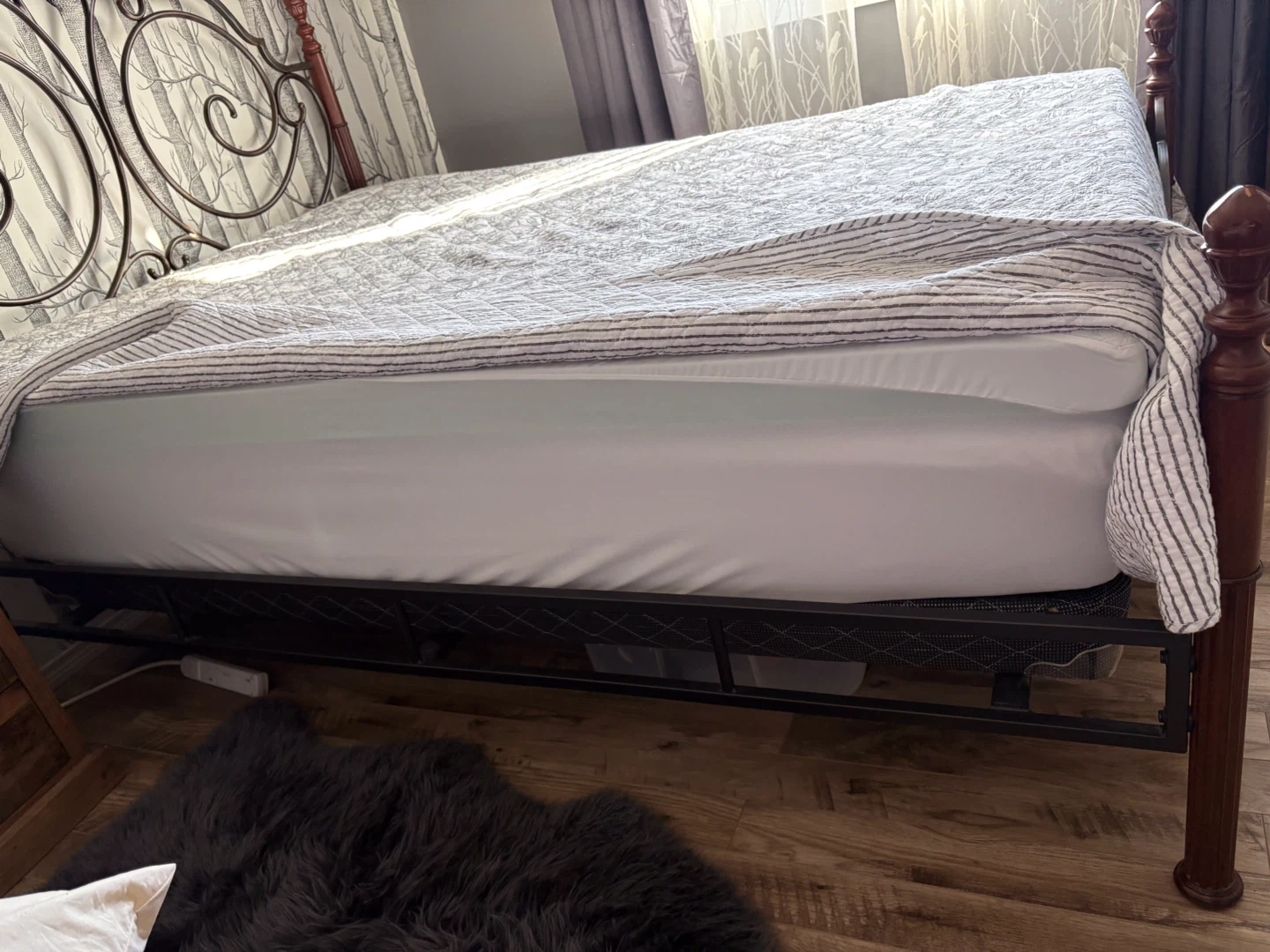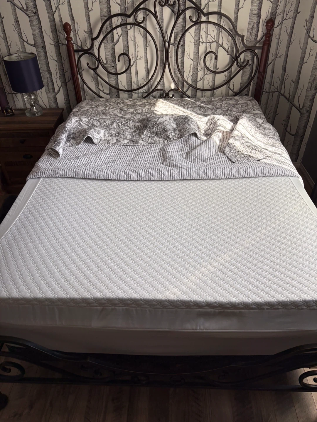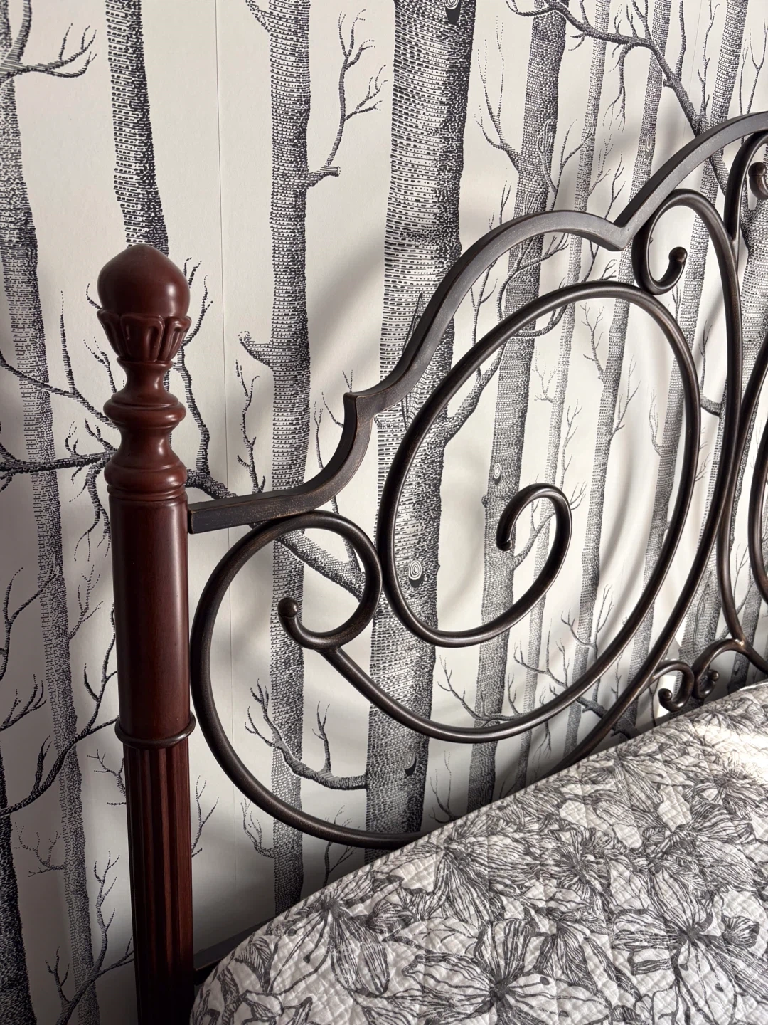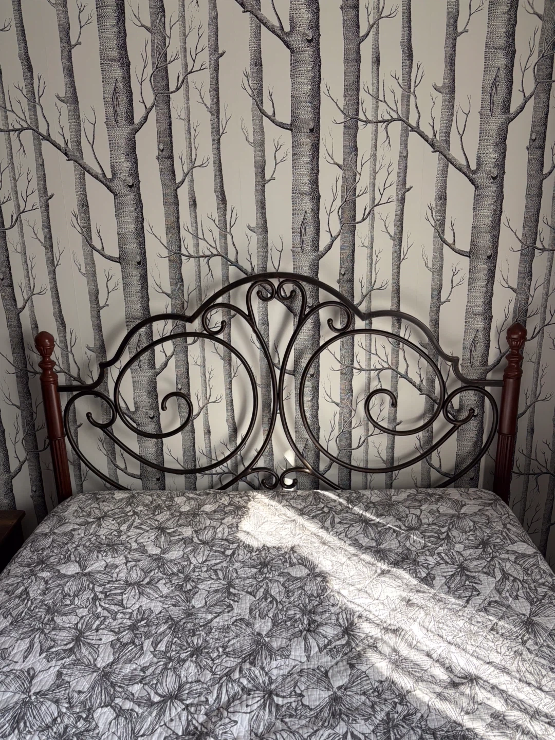 Selling a beautiful double/full scrolled work metal bed frame and mattress. It features a brown and black finish with a decorative headboard and footboard. In like new condition, used in spare bedroom. Needs a box spring for mattress support but comes with a double BeautyRest mattress in excellent condition. Also includes 3” mattress topper to add more cushion. Big bonus with this frame is the support legs are in the center so no banging of toes on middle support legs. Frame is tall enough for under bed storage boxes. Low profile footboard is beautiful and allows for easy tucking of bedding. Has adjustable feet to increase stability. A beautiful addition for an upscale bedroom look. Furniture is located in Signal Hill SW Calgary. Posting for family member.