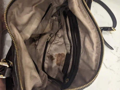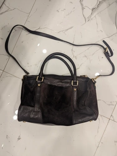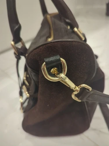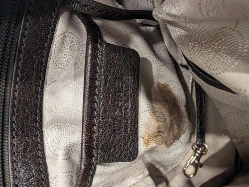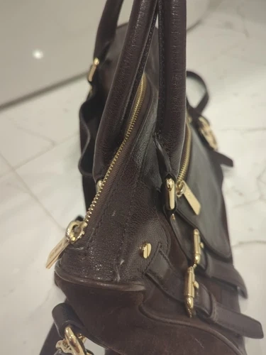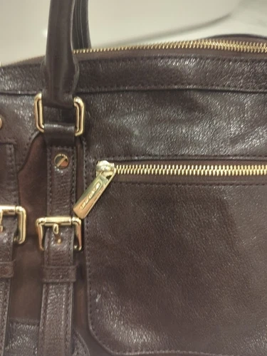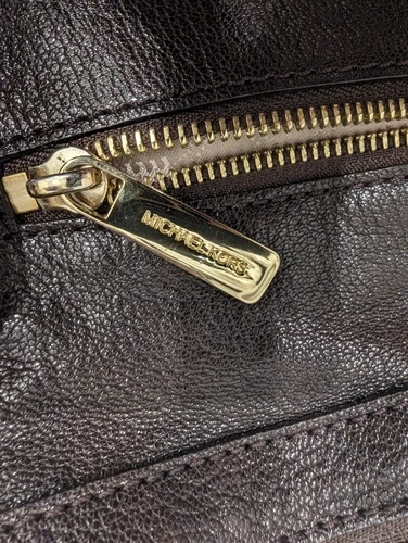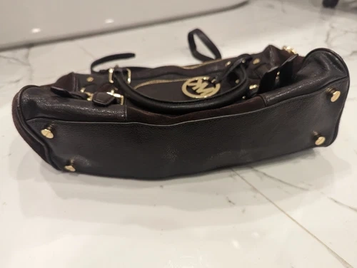 This Michael Kors McGraw Leather Convertible Slim Satchel Crossbody Bag in Dark Brown is a stylish accessory. It features a pebbled finish and gold tone hardware with a zip closure. The crossbody strap has a drop of approximately 20 inches. The bag measures 14 inches wide, 9.5 inches high, and 2.5 inches deep. It has a lined interior with multiple pockets, including outer and inner pockets, and a mobile phone pocket. A detachable strap and bag charm are included. This versatile bag can be worn as a crossbody or a hipster. There is a makeup stain inside the bag, visible in the photos.