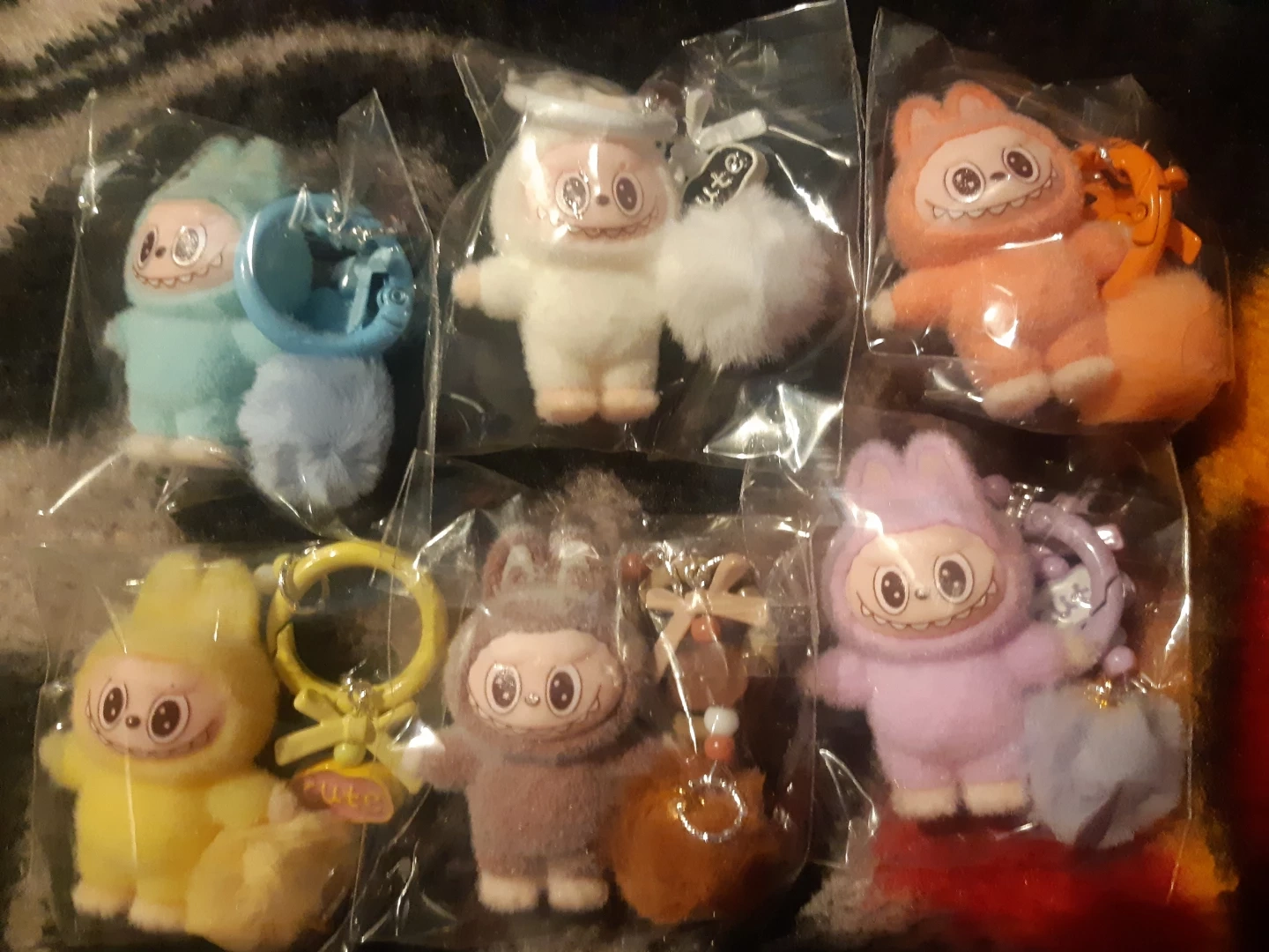 Set of assorted Labubu keychain charms featuring cute character designs. Each charm comes with a keychain ring and some include extra fluffy pom-poms. Various colours available.