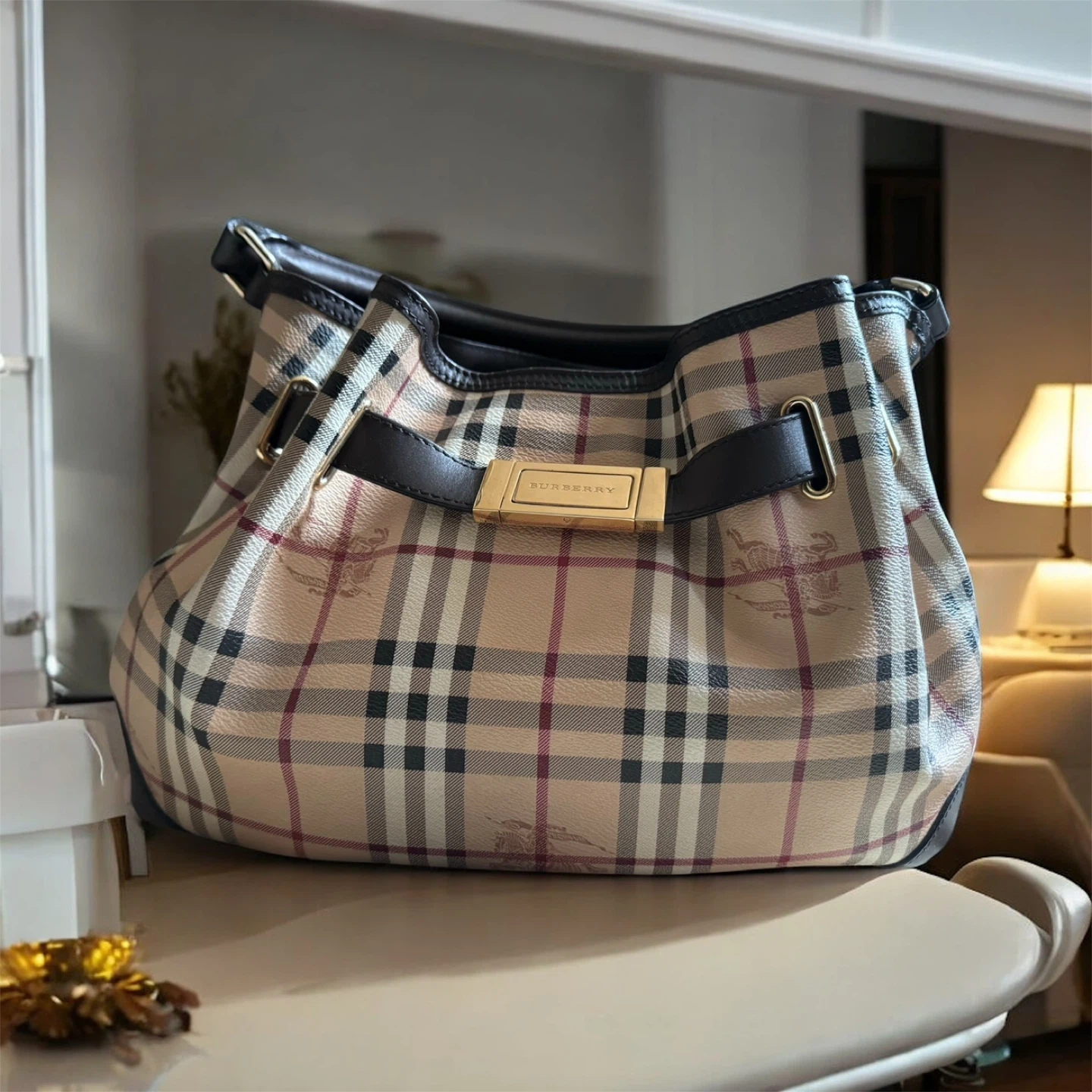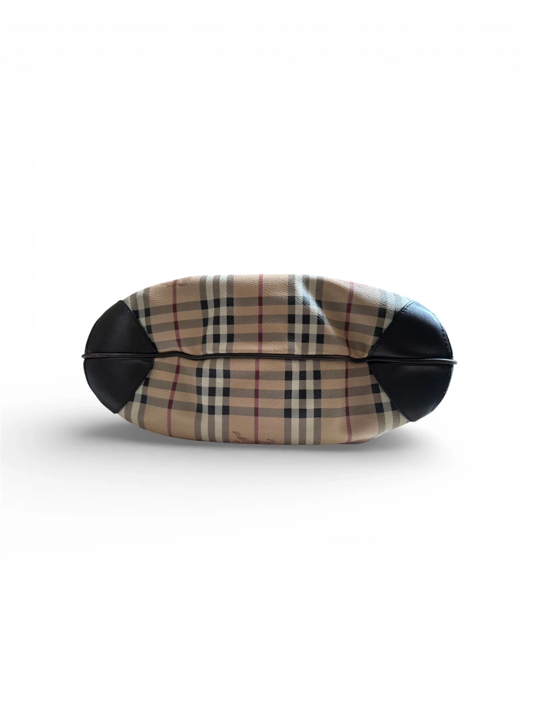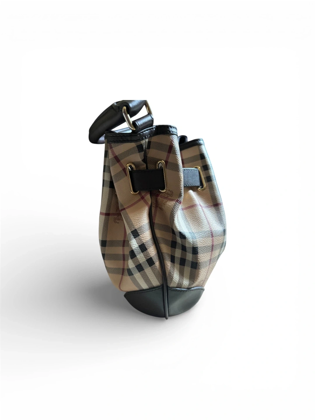 A classic Burberry handbag. It has a brown leather handle and trim with a gold clasp closure. The bag is a traditional Burberry check pattern with a horse and rider emblem. It has a brown leather bottom and a detachable shoulder strap. The bag is perfect for carrying your essentials around town.