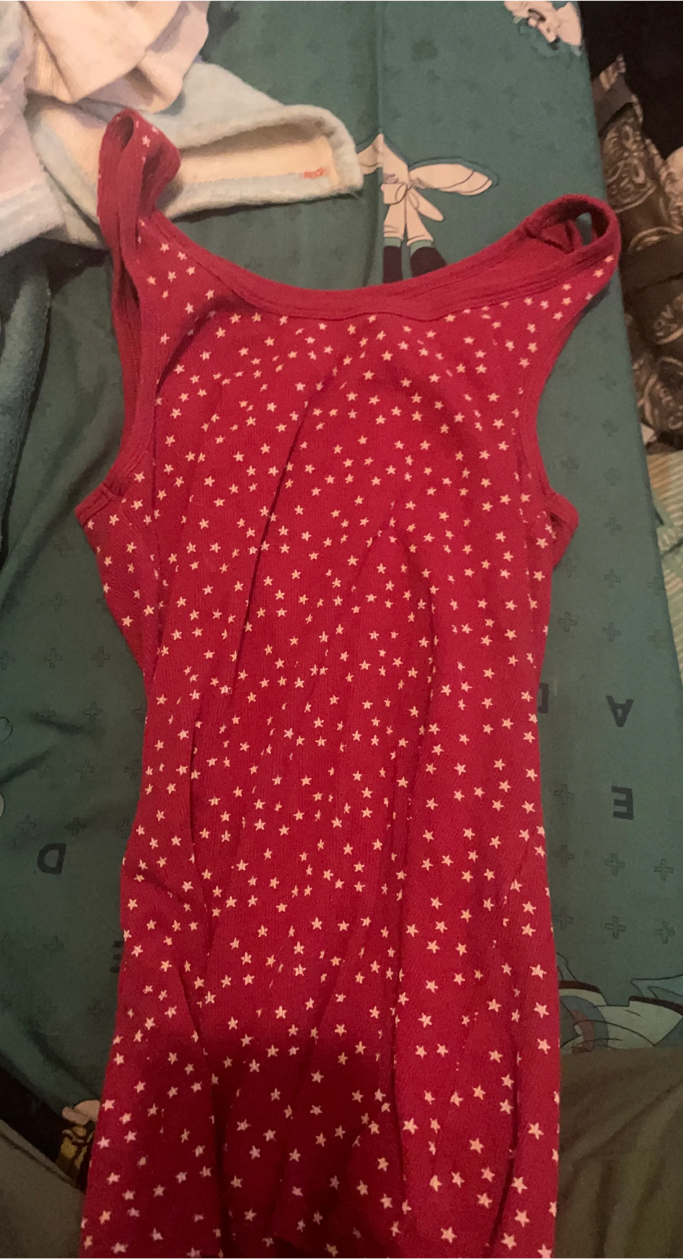 This is a children's sleeveless tank top in a vibrant red with a fun white star pattern. It's a comfortable and playful addition to any kid's wardrobe. Made from soft fabric for everyday wear.