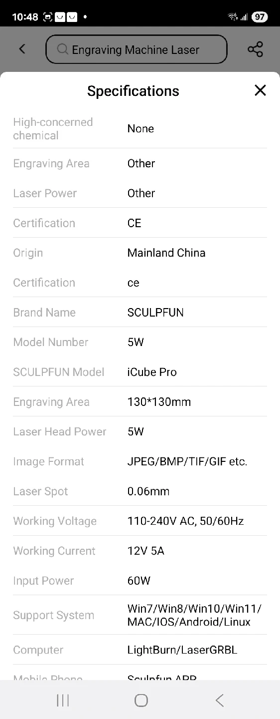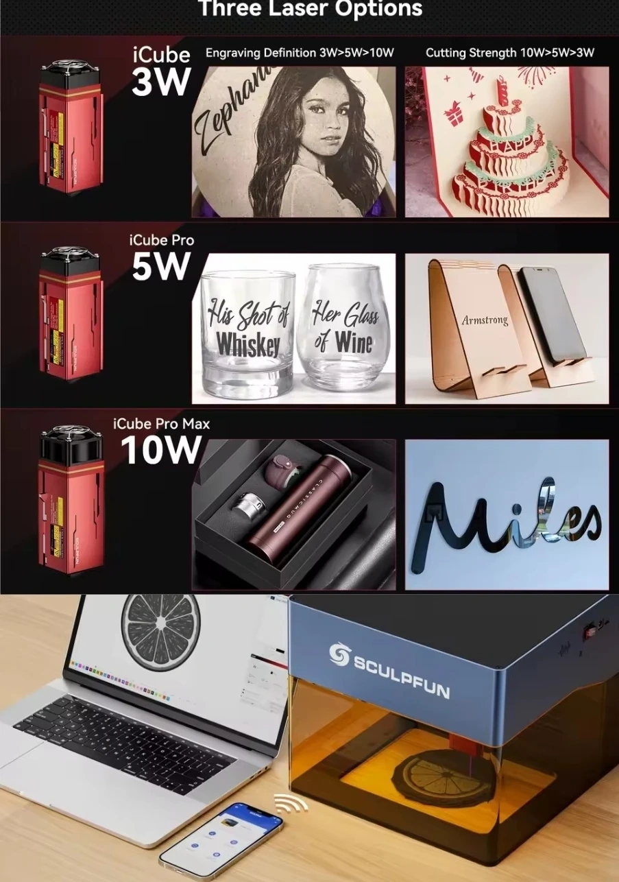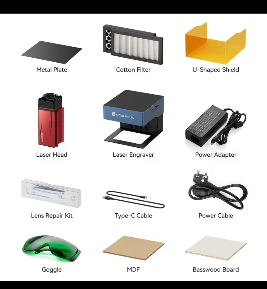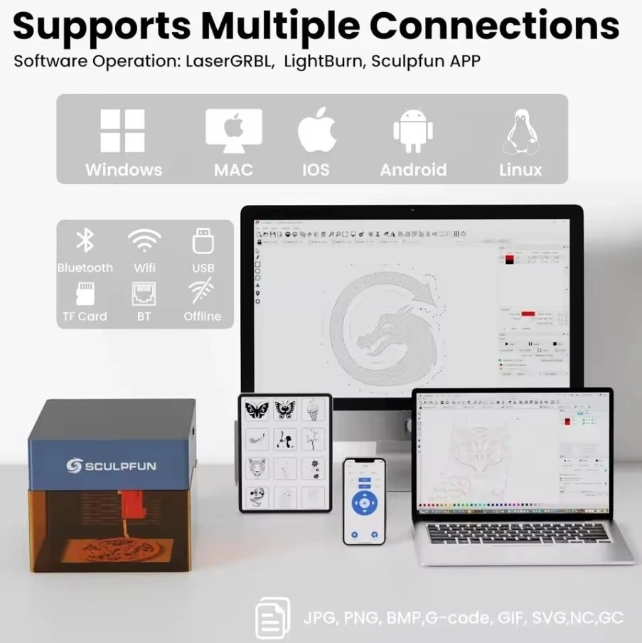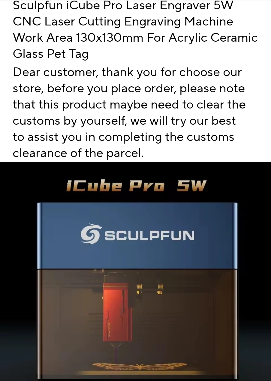 25I'm selling a Sculpfun laser engraver! It's great for engraving on many materials such as glass, wood, leather, crystal, and more. It supports multiple connections such as Windows, MAC, iOS, Android, and Linux. It also has reliable laser protection with a detachable fully enclosed design eye shield! Product size: 300*262*226mm. USA PLUG, *5W ultra lightweight fine laser engraver. * built-in smoke filter. * Multiple connections methods, cellphone, computer connections App. * Temperature alarm system built-in with Stop n Run by cooling the equipment. * Enclosed eye protection shield 🛡. * Replaceable laser lens that would adapt to Sculpfun cub series. **** This unique automated Laser engraver will be shipped directly from the factory, you are responsible for providing accurate information for shipping address and receiving the product from the customs department. please provide email for more information and details . there is more to know about the usage of the mechanical interior movement and how it can help you achive the best result or not facing any technological problems. Simply send us your email and request for complete catalog and power with system Run information. this will help you understand and set up the unit by easily following the instructions. This is the email that you sent your request info. Shaneasa1@gmail.com thank you.