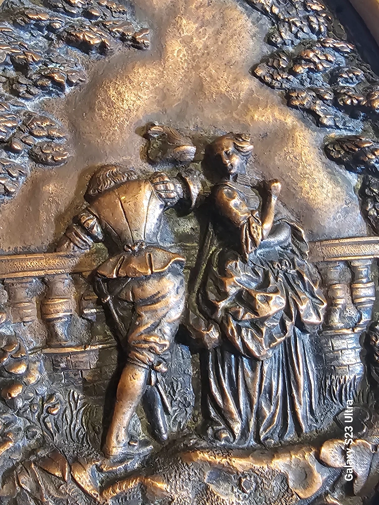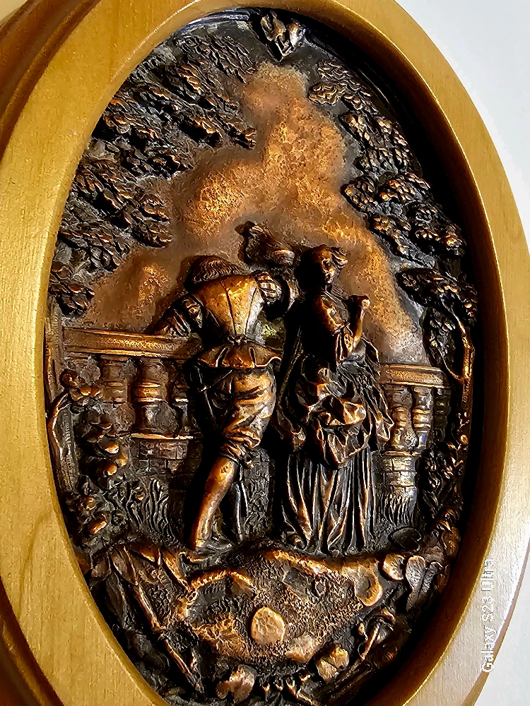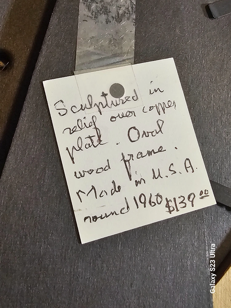 10This is a sculptured relief over copper plate in an oval wood frame. It was made in the U.S.A. and originally bought for $139