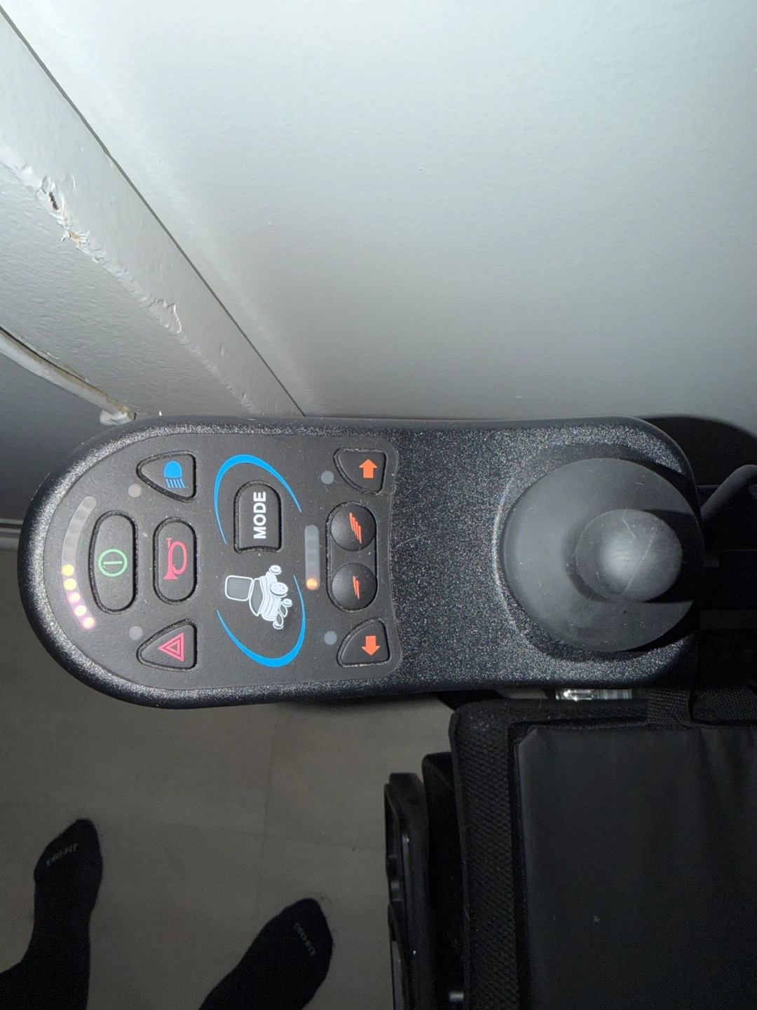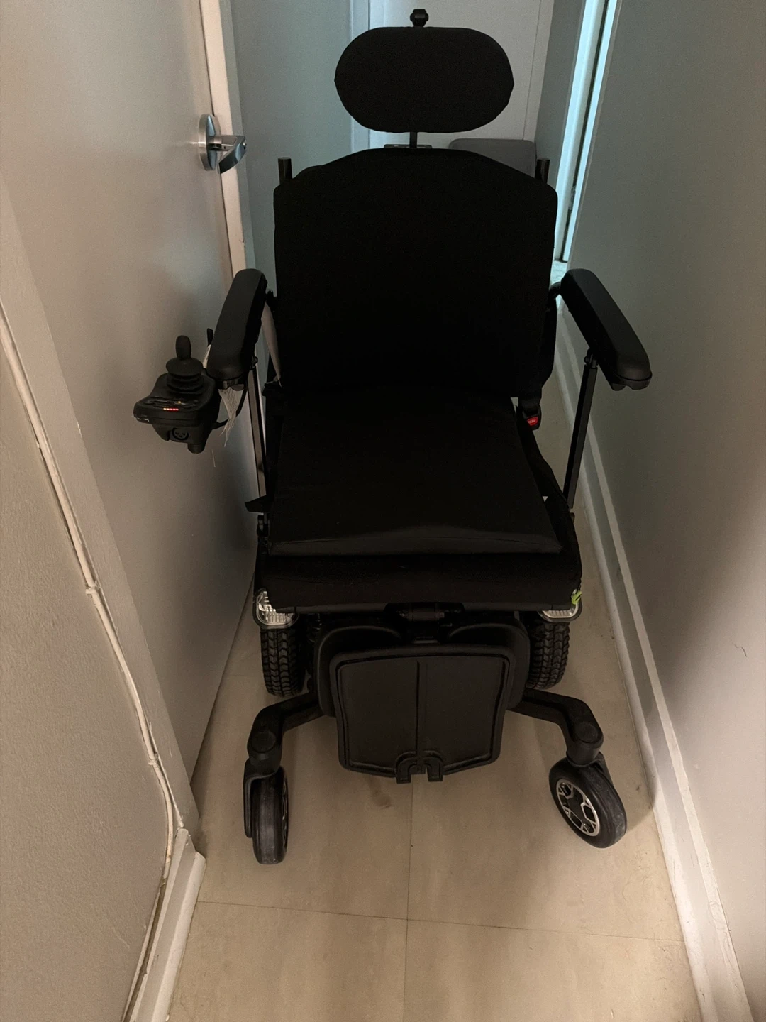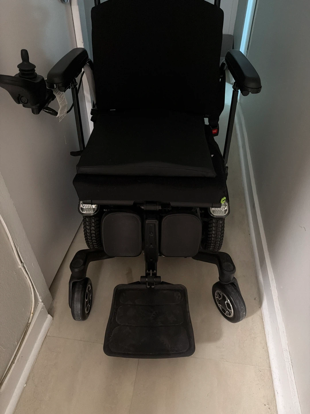 ROVI X3 power wheelchair with attendant control. Black upholstery. Features a joystick for operation and rear lights.