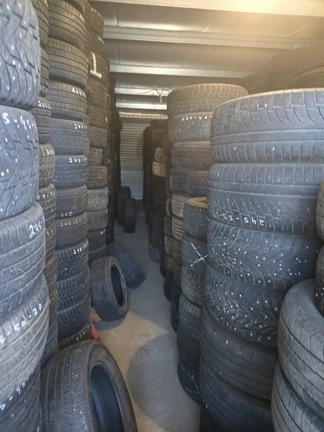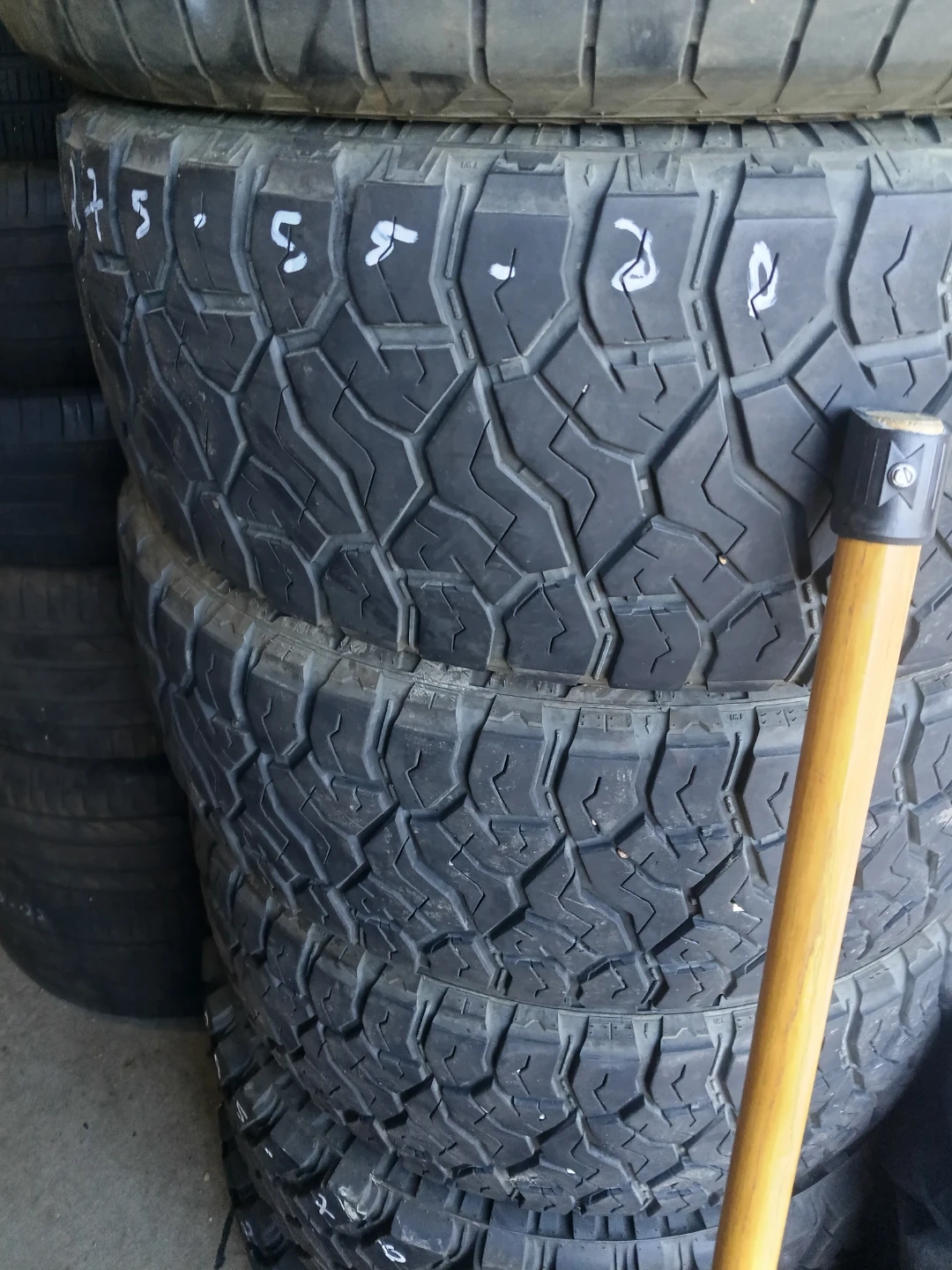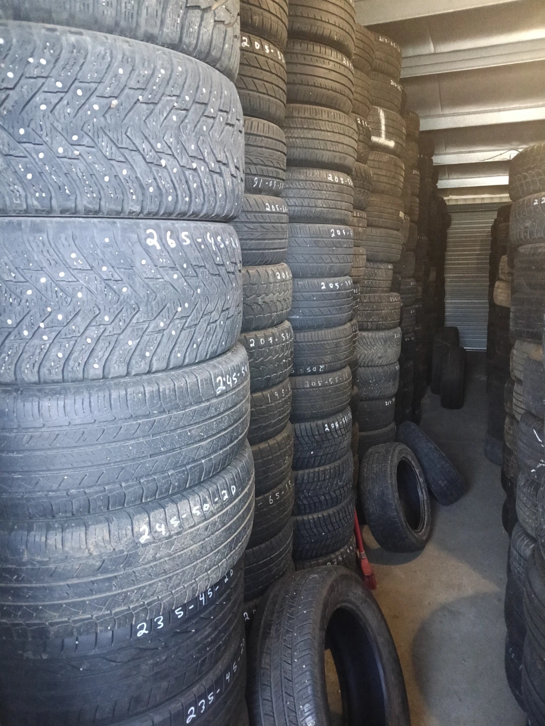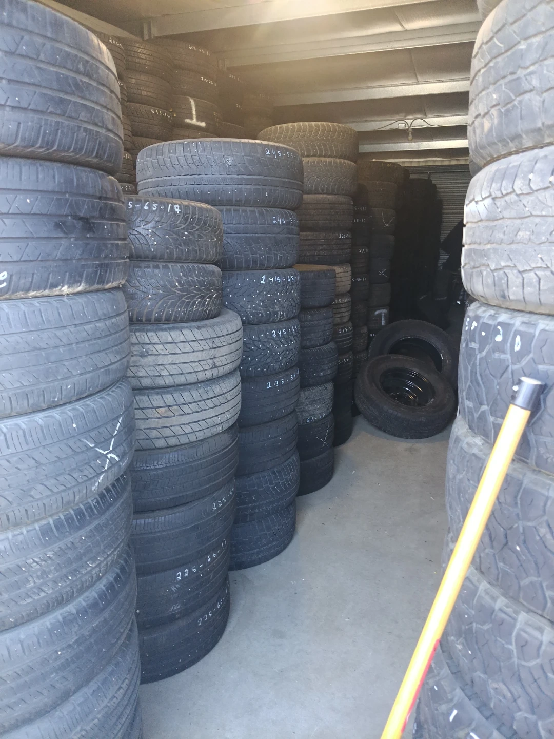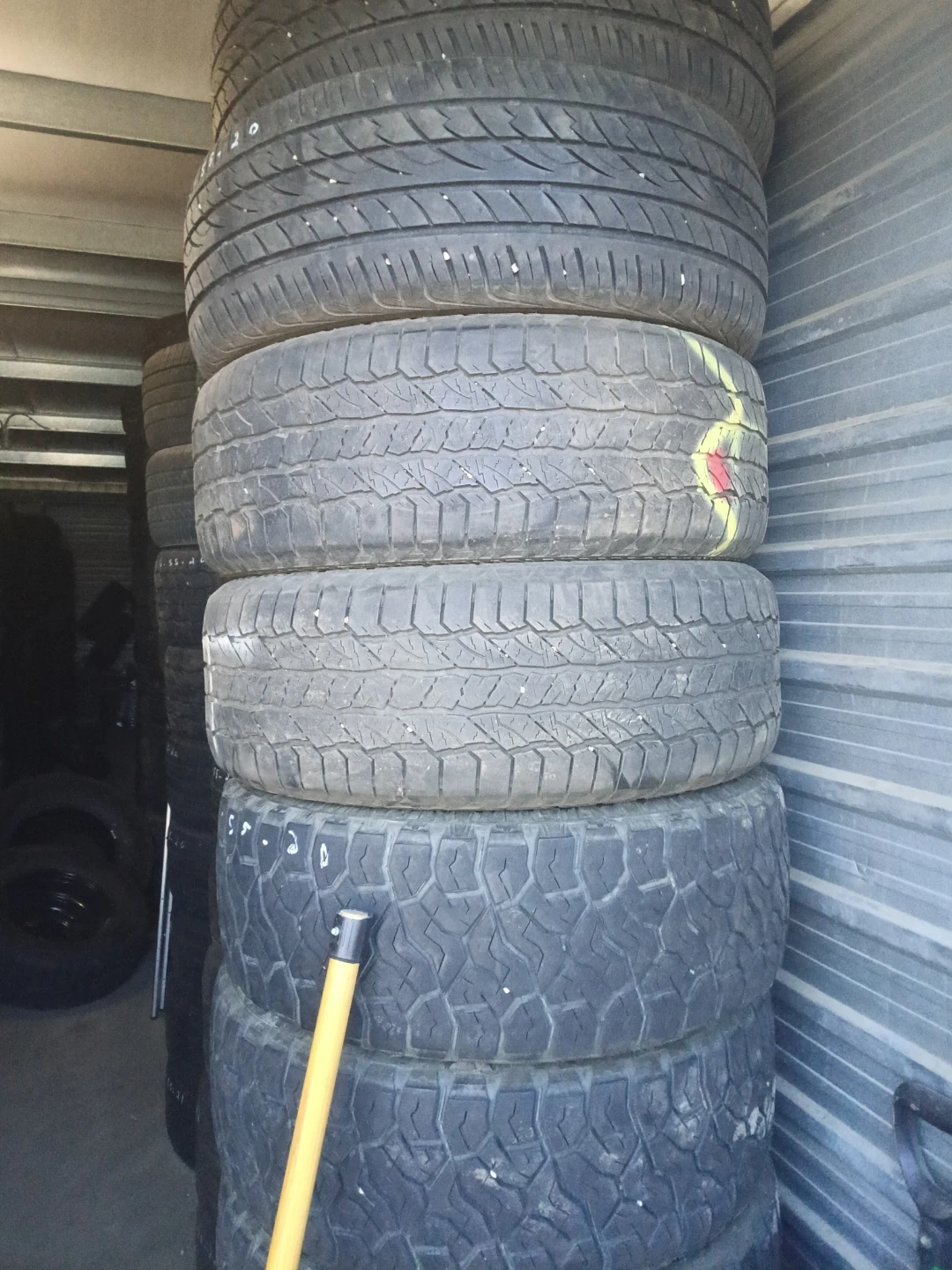 A stack of used tires ready for a new life. Various sizes are visible, including some marked with 265-55-18. These tires are suitable for a range of vehicles. They're ready for pickup!