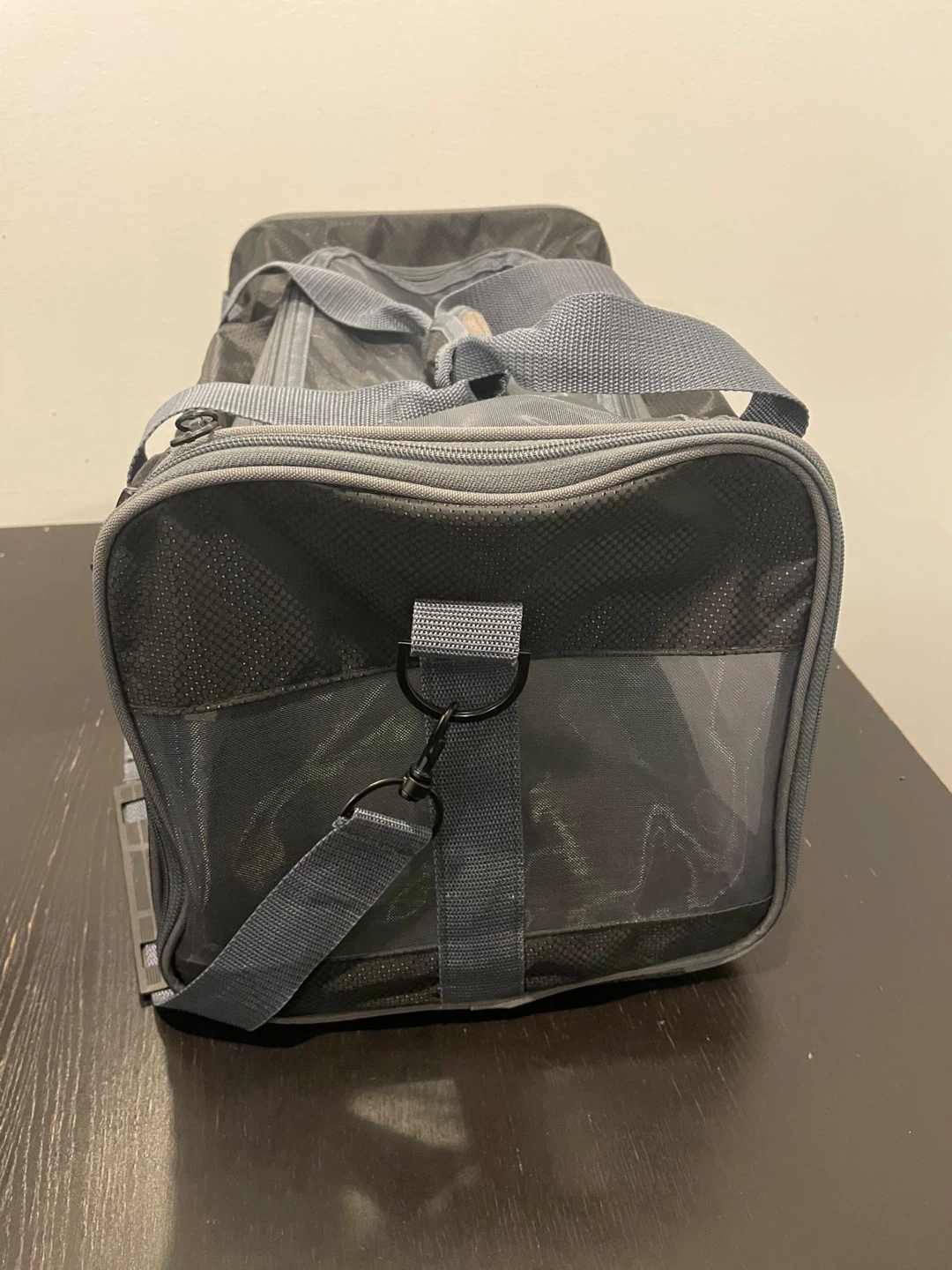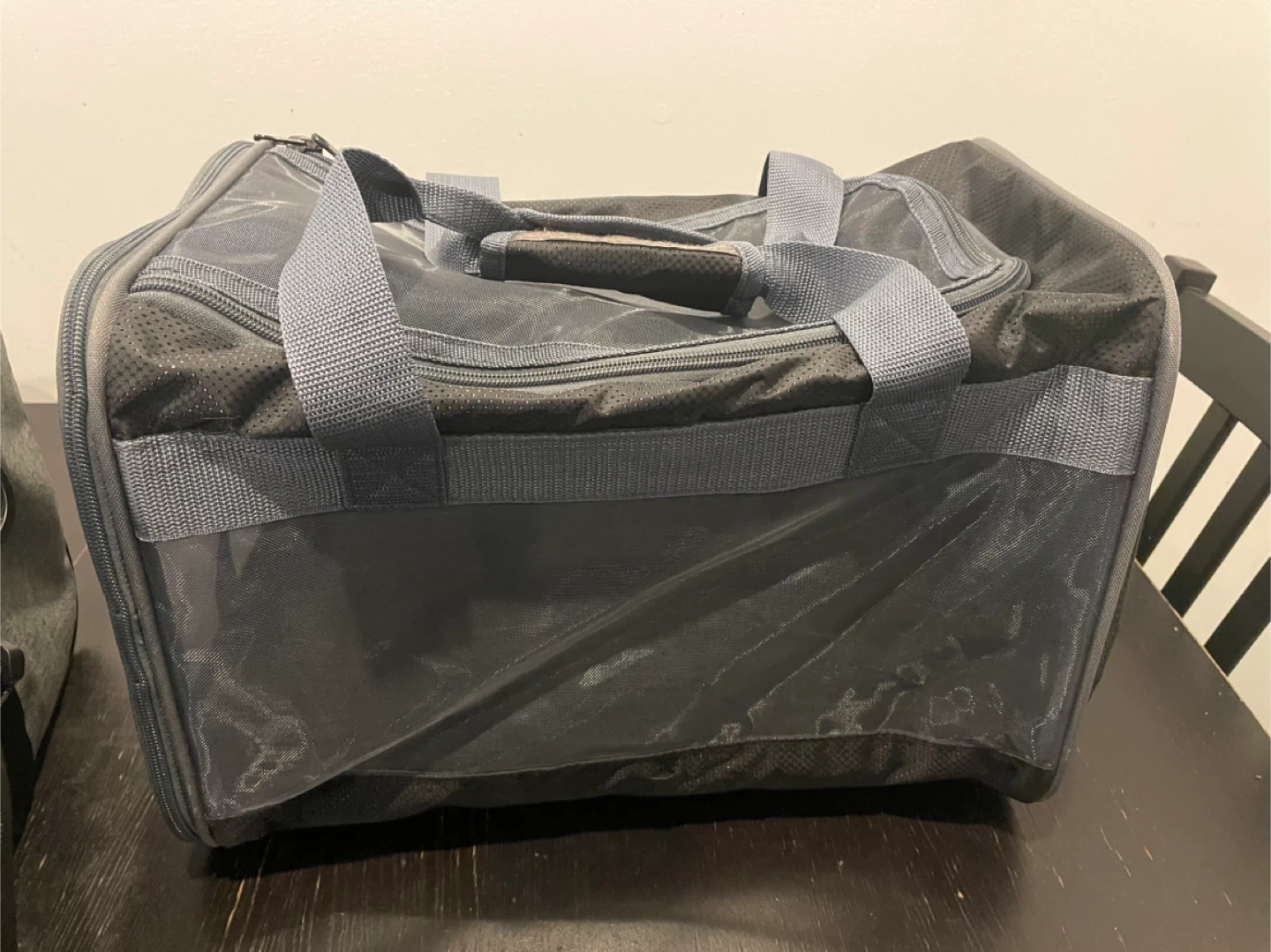 This pet carrier bag is made of durable nylon and mesh. It features a top handle and a shoulder strap for easy carrying. The mesh panels provide ventilation for your pet. It's suitable for small dogs or cats. Only used a couple of times and is very clean.