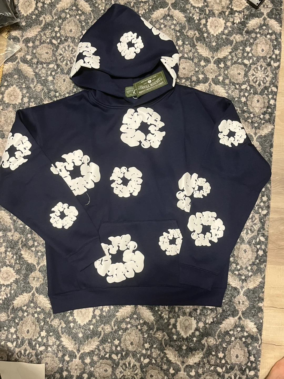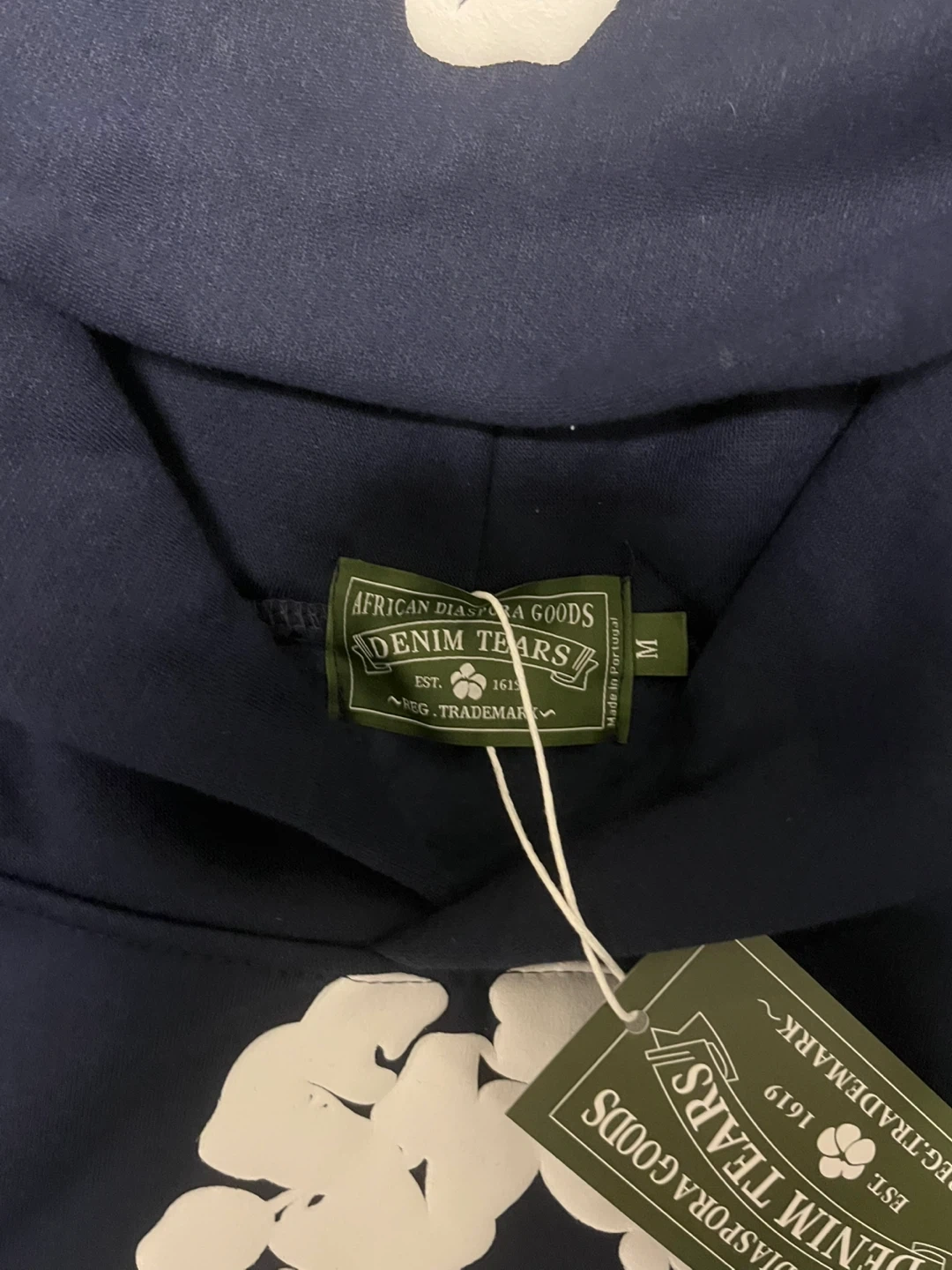 This is a navy blue hoodie from DENIM TEARS, featuring a distinctive all-over white floral print. It's a size medium and made in Portugal. The front has a kangaroo pocket and a drawstring hood. This hoodie is a statement piece for any streetwear collection.