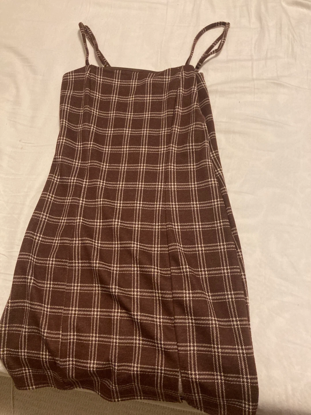 Cute brown slip dress with a classic plaid pattern. It has thin adjustable straps and a modest slit on one side. This dress is perfect for layering or wearing on its own!—