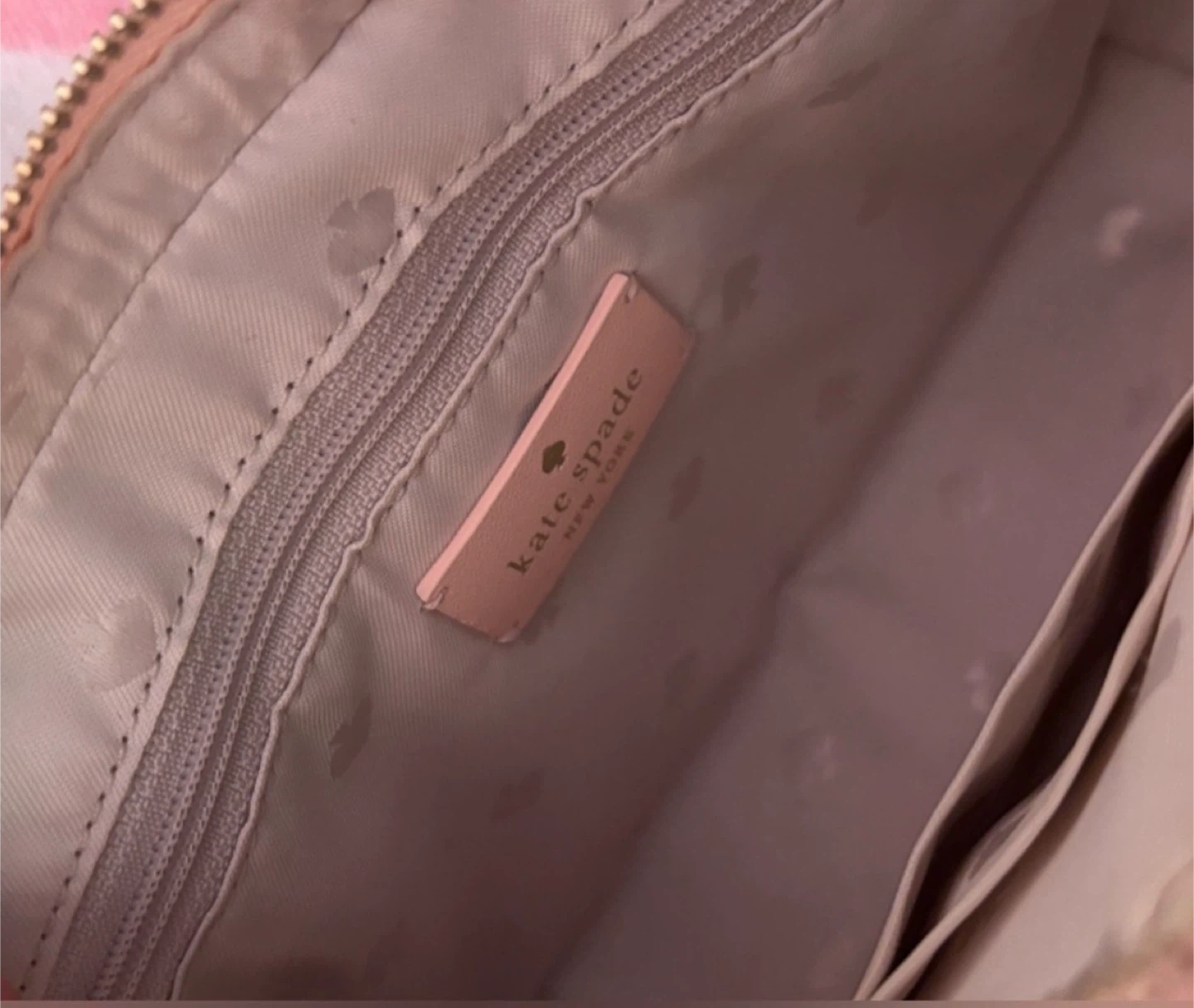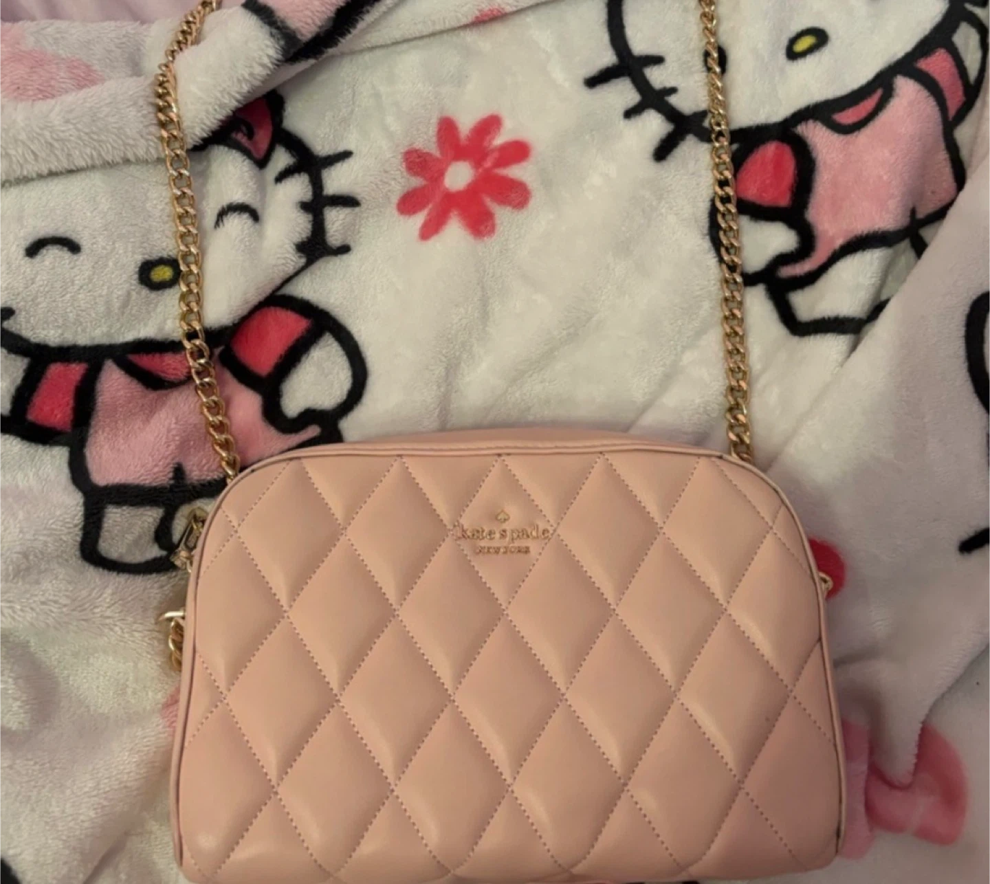 This is a pink quilted leather camera bag by Kate Spade. It has a secure zip closure and a stylish gold chain strap. A great bag for carrying your essentials! Bought and paid in The United States