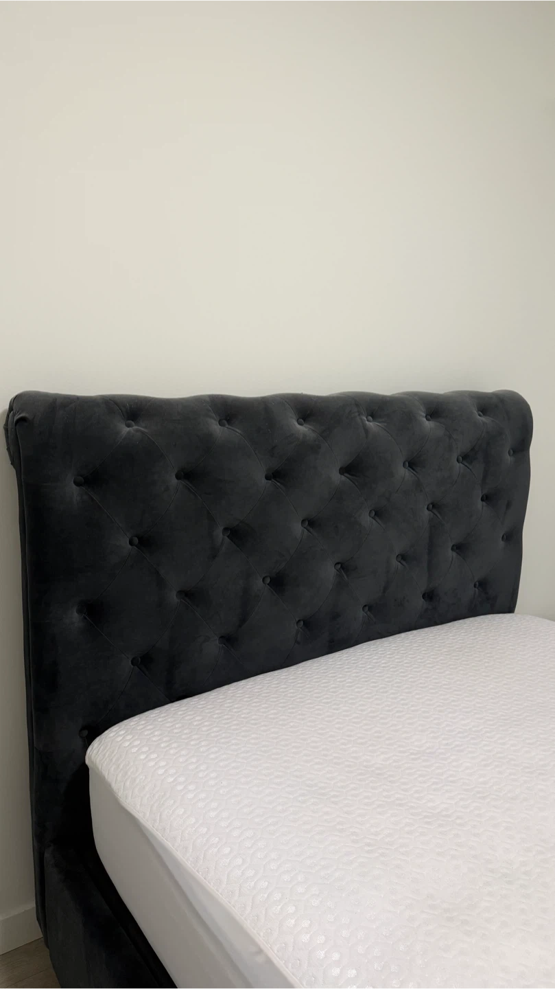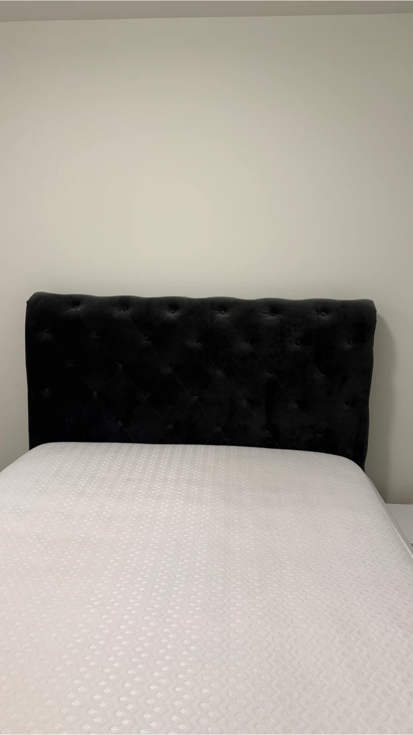Selling a queen-sized bed frame with a stylish, tufted headboard. The bed frame is in great condition. Perfect for adding a touch of elegance to your bedroom!