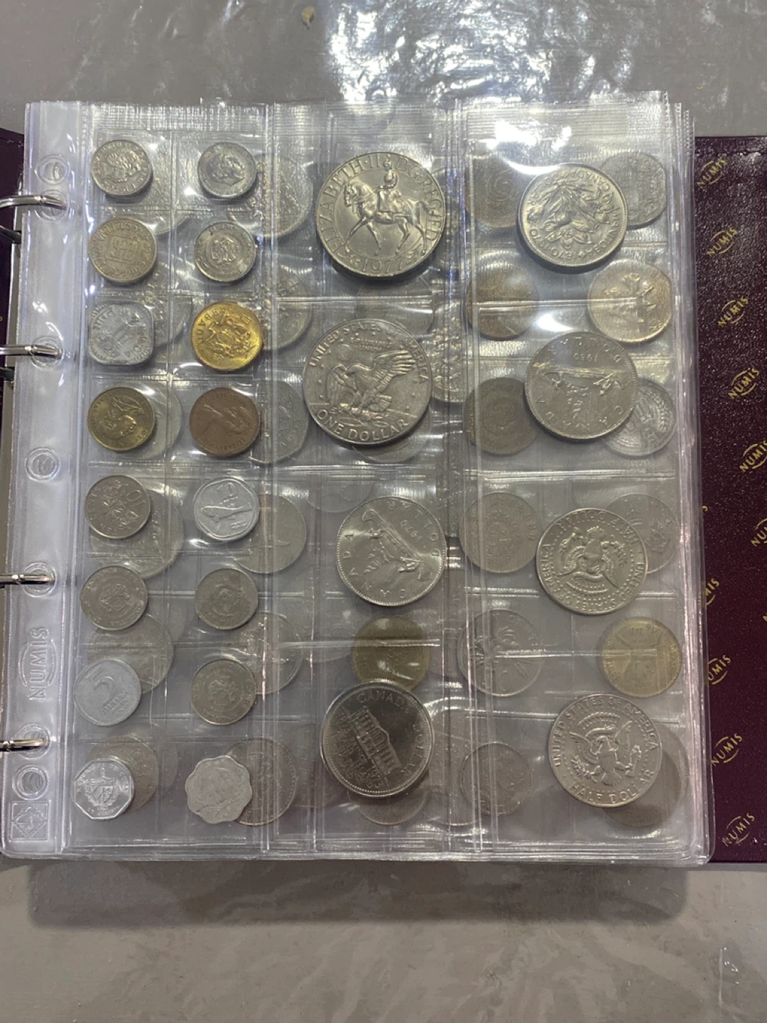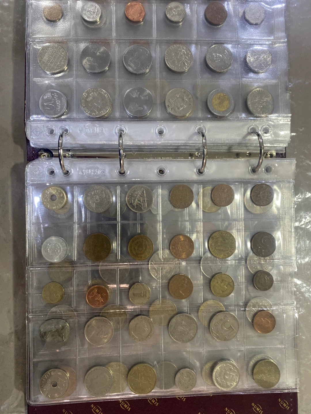 A collection binder filled with assorted coins from different countries and eras. It features multiple pages to display and organize your coins securely. This binder is perfect for coin collectors looking to expand or manage their collection.