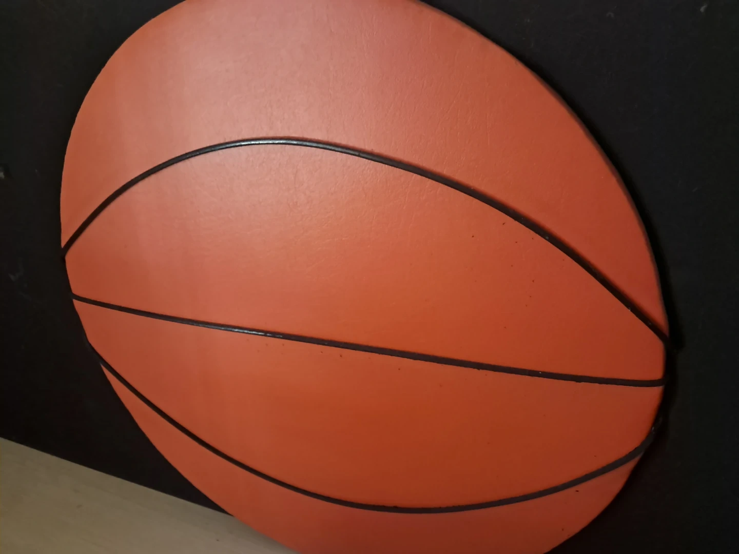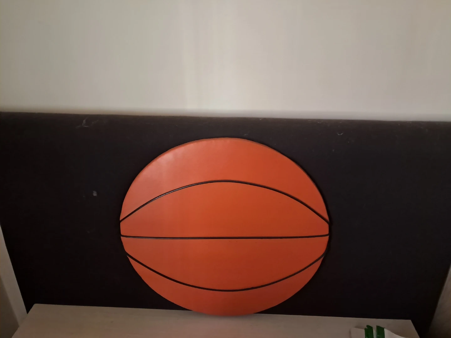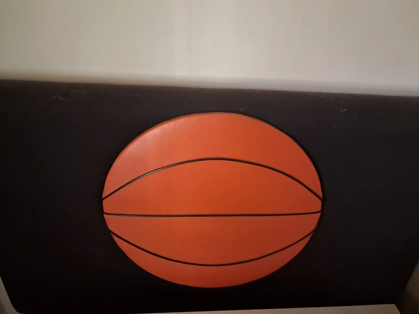 Basketball-themed twin size headboard. Vinyl leather type orange with black lines mimicking a real basketball. Black canvas padded covered headboard. Metal legs. Bolts to a twin frame. This piece adds a sporty touch to any room!