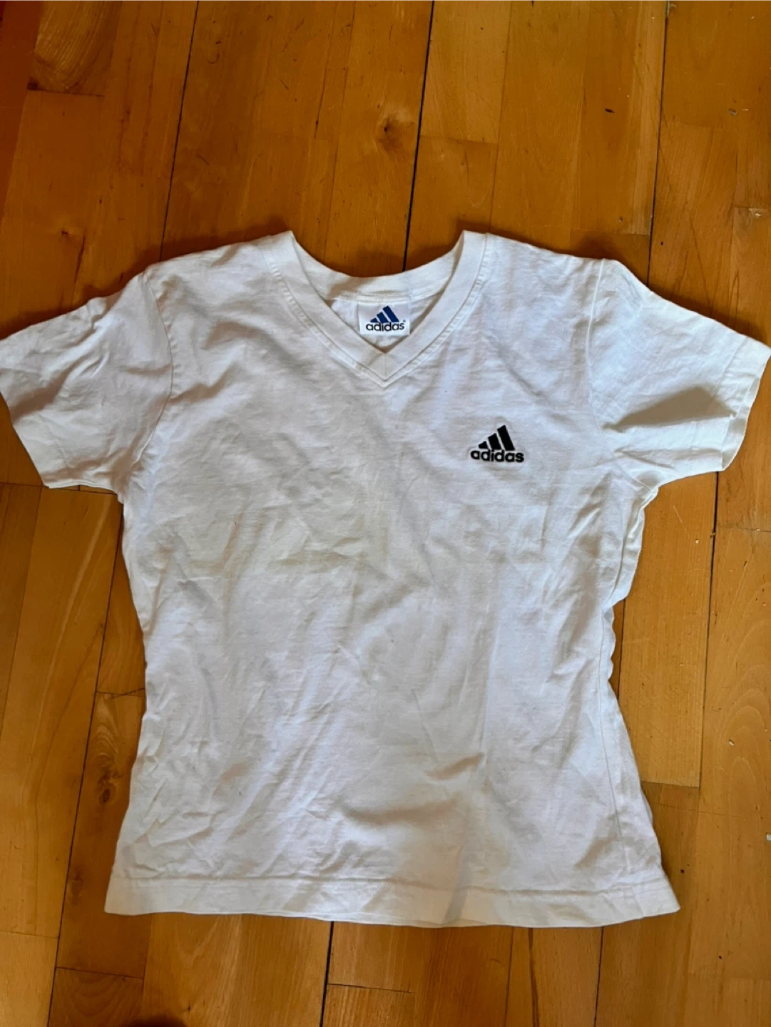 This is a white Adidas V-neck t-shirt. It's made of a soft cotton blend for comfort. The classic Adidas logo is printed on the chest.