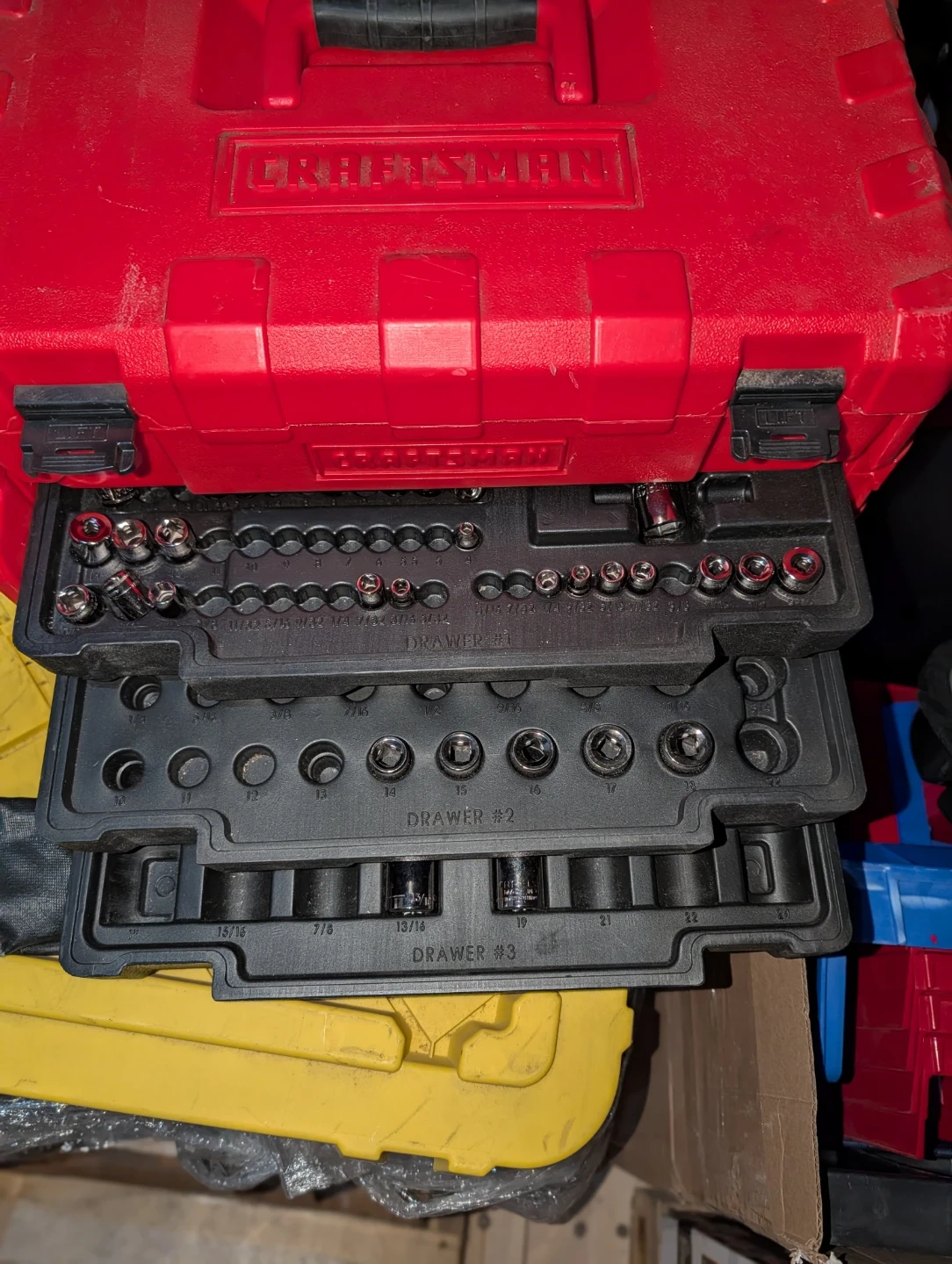 This red Craftsman tool chest contains a socket set with multiple drawers. Includes various sizes of sockets. Sold as is. Case is like new, most of the socket drivers are new
