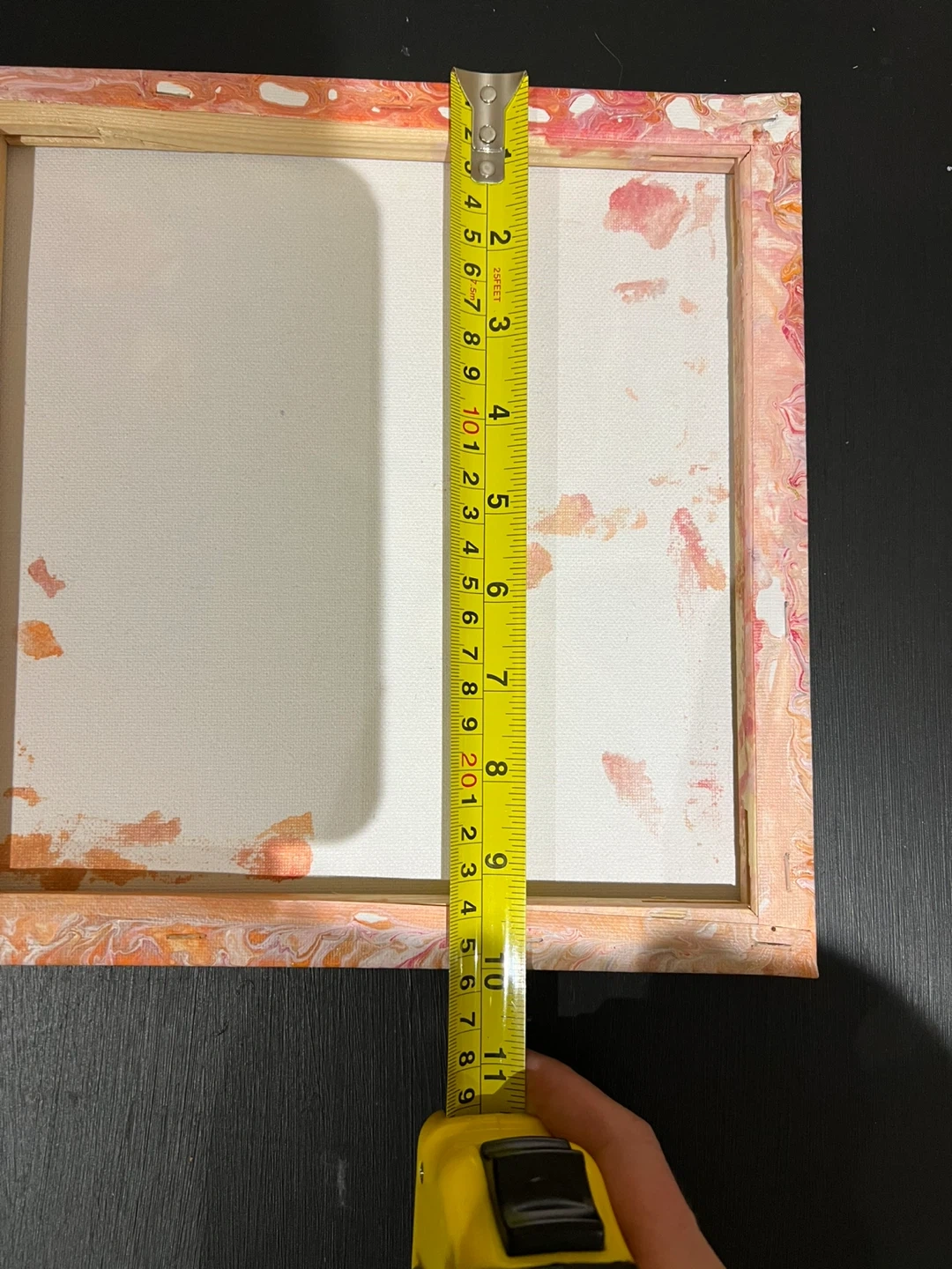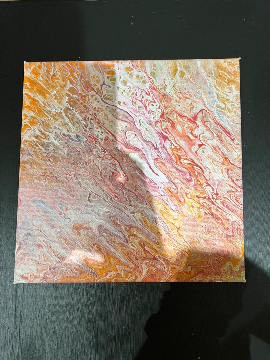 Acrylic pour painting on a stretched canvas. Features swirling patterns in shades of orange, pink, white, and a hint of purple. Canvas measures approximately 10 inches by 10 inches.