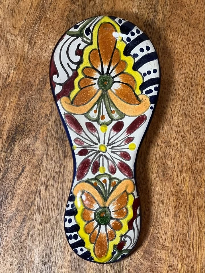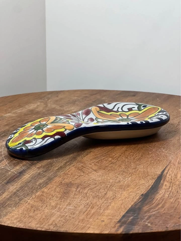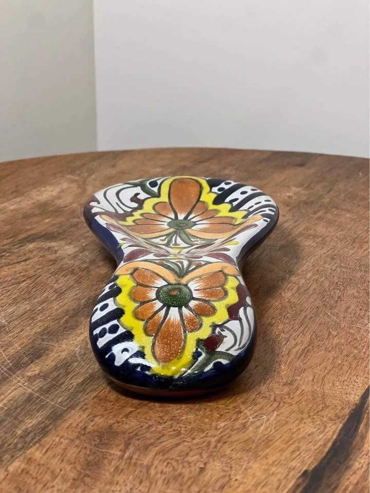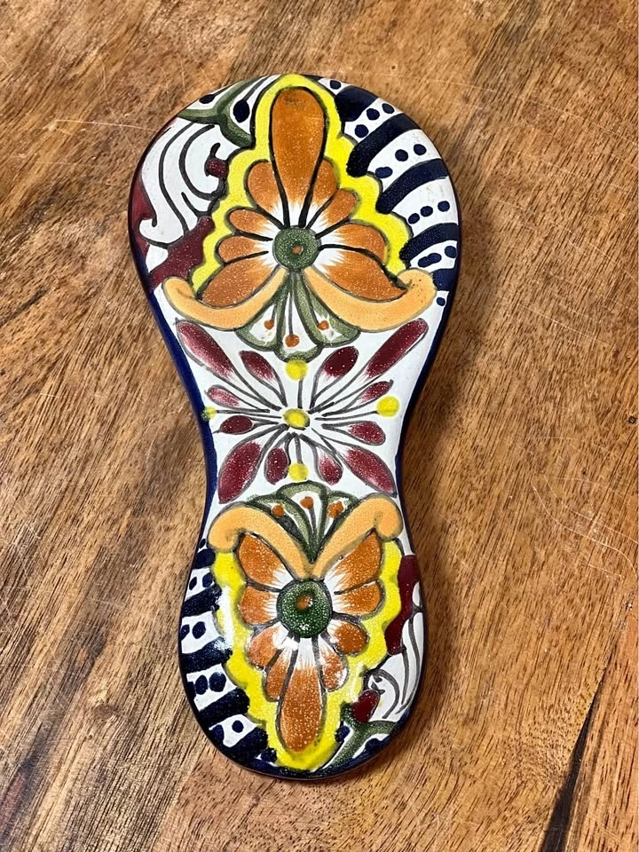 Gorgeous Talavera spoon rest with vibrant colors, perfect way to add a touch of style to your kitchen. Measures 7 1/2" in length, 3 3/8" in width, and 1 3/8" in height. Preowned. Pickup is 58th and 7th Ave in midtown Manhattan.